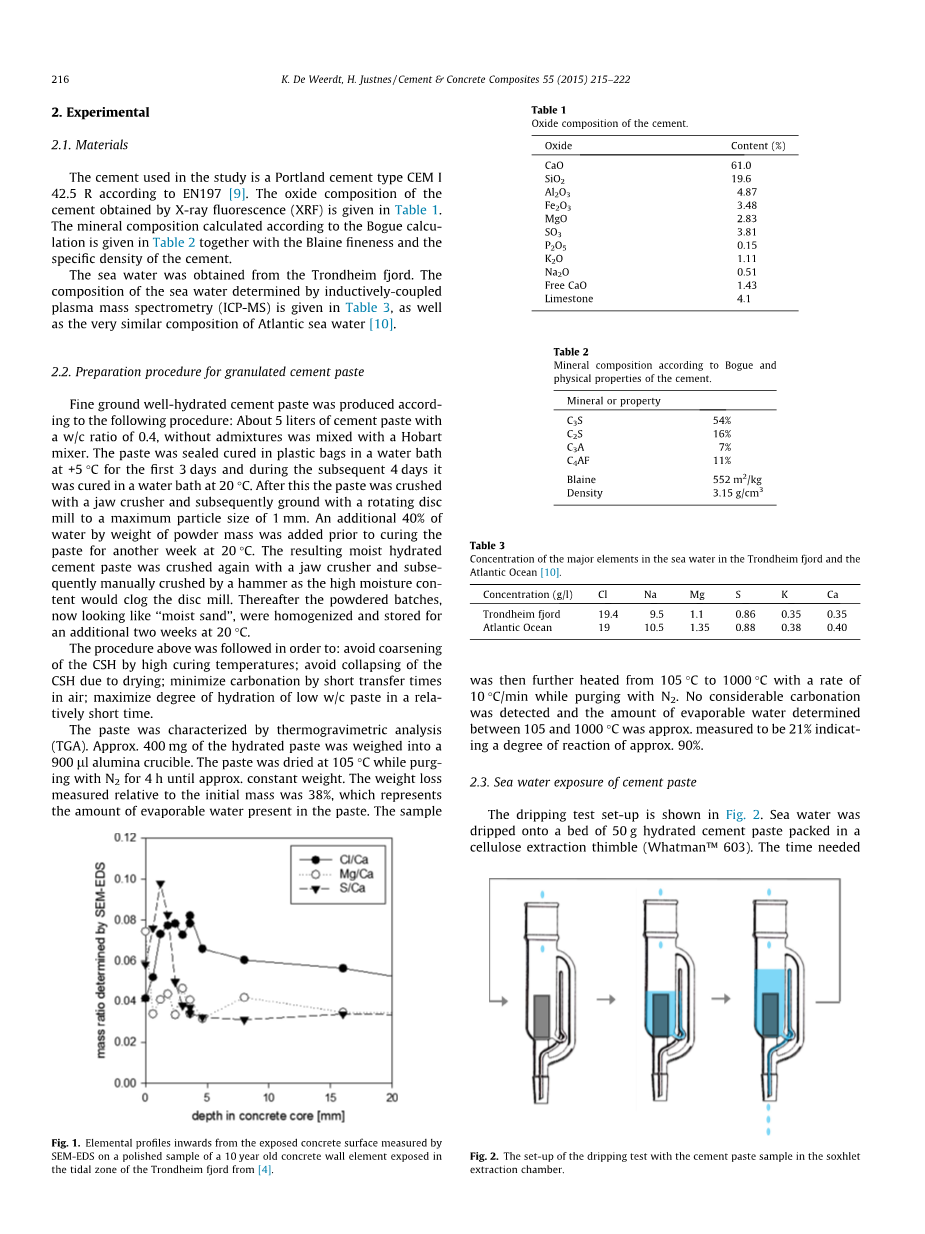 研究中使用的水泥是波特兰水泥型CEM i42.5 R根据en197 [ 9 ]。X射线荧光得到水泥的氧化组合物(XRF)在表1中给出。矿物组成的计算根据博格计算如表2和布莱恩细度与水泥的比密度。从特隆赫姆峡湾的海水了。电感耦合等离子体质谱法测定海水的成分(ICP-MS)在表3中给出,以及大西洋海水[ 10 ]非常相似的成分。