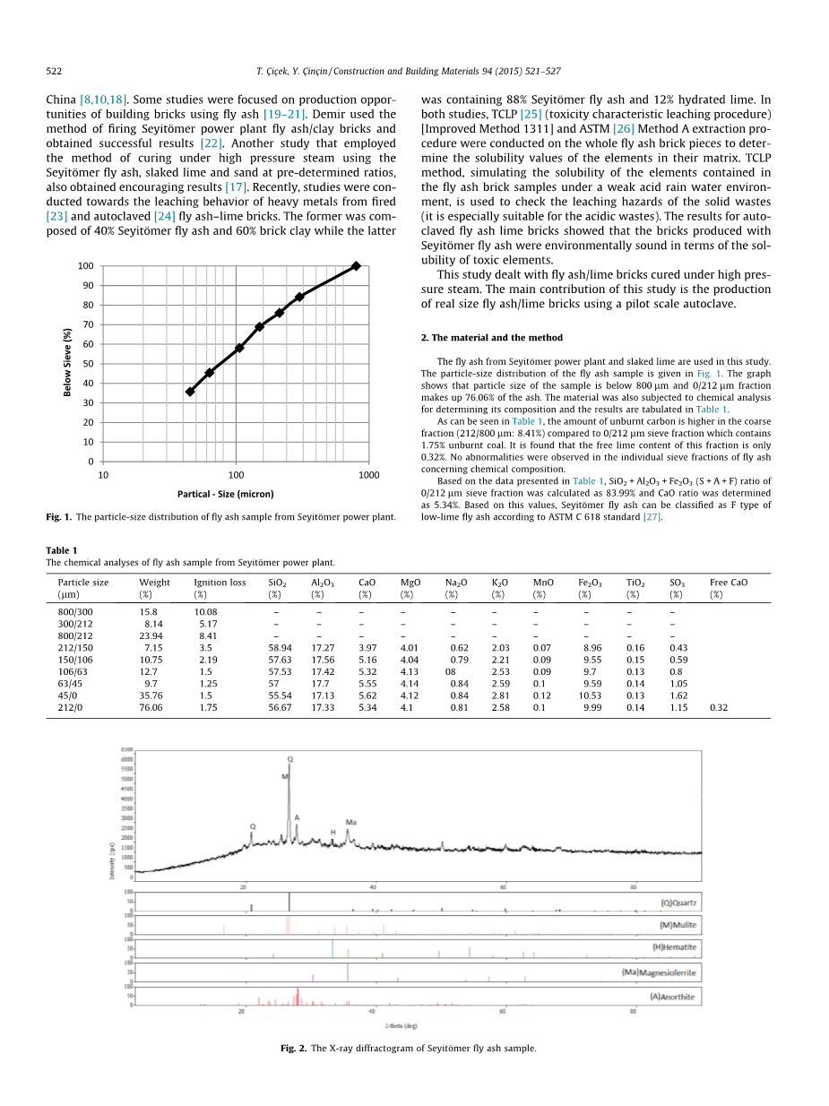 本研究采用Seyitouml;mer发电厂的粉煤灰和熟石灰。粉煤灰样品的粒度分布图在图1中给出。图片显示粉料样品的粒度在800mu;m和0/212mu;m以下的部分占76.06%。同时也将材料进行化学分析以确定其组成,其结果如下表1。