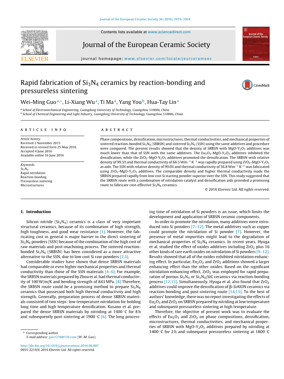 英文题目Rapid fabrication of Si3N4 ceramics by reaction-bonding and pressureless sintering