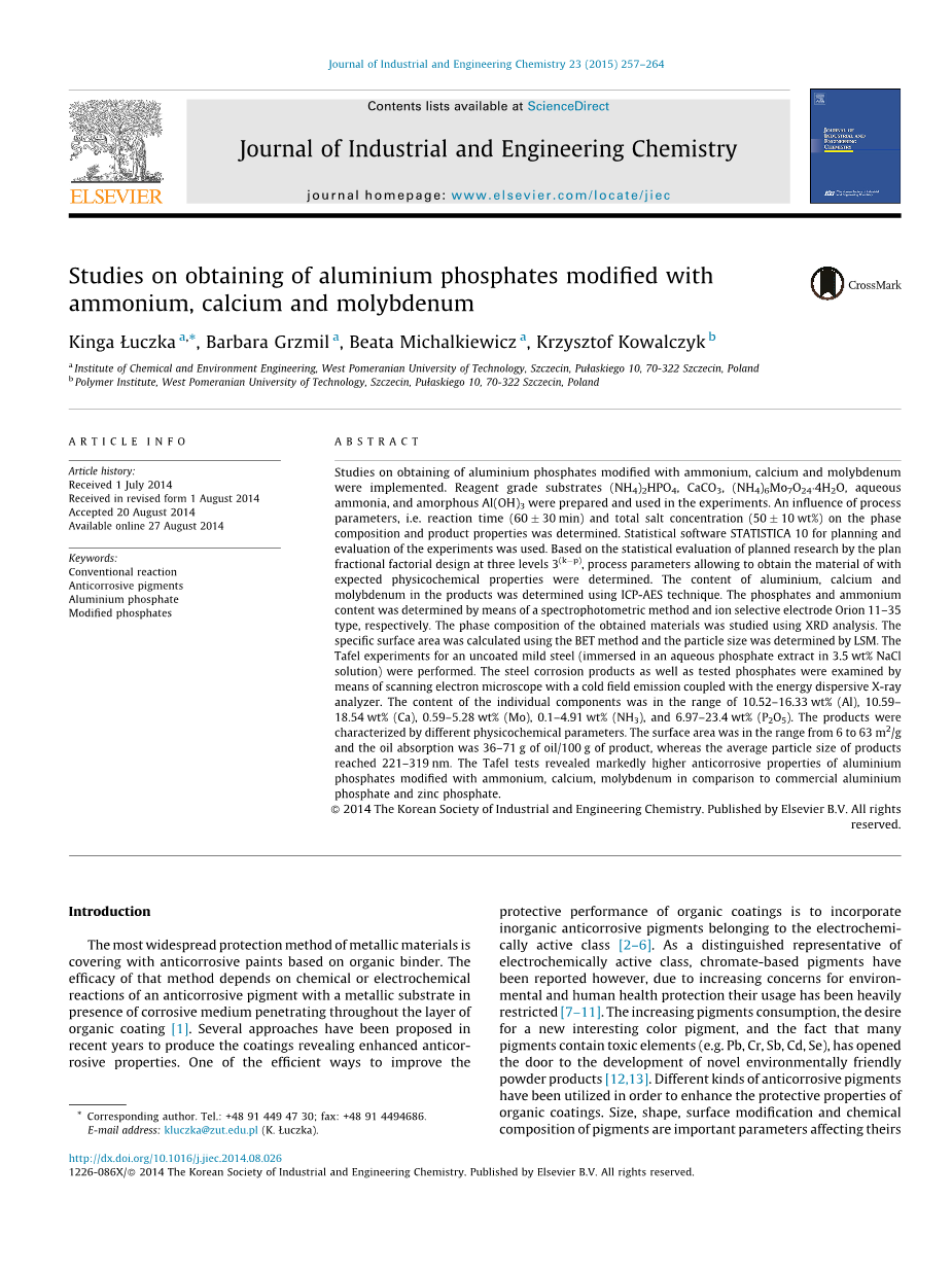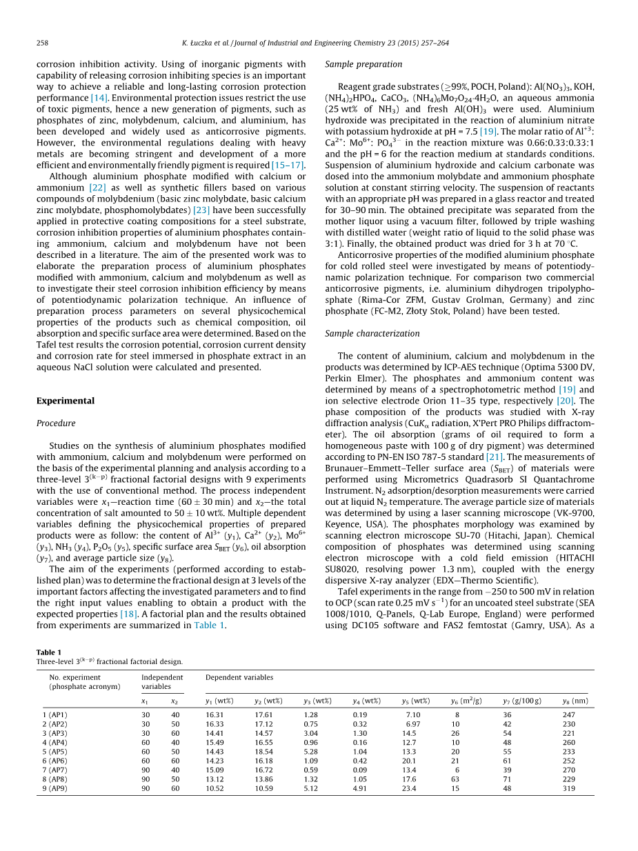 铝、钙和钼在产品的含量决定了使用icp - aes技术。磷酸盐和氨内容是分别通过分光光度法和离子选择性电极猎户座11-35类型。获得材料的相组成进行了研究使用XRD分析。比表面积的计算选择方法和粒子的大小由LSM决定。塔菲尔实验低碳钢(沉浸在一个磷酸水溶液提取在3.5 wt %氯化钠解决方案)进行。钢铁腐蚀产物以及测试考察了磷酸盐意味着与寒冷的场发射扫描电子显微镜加上能量色散x射线分析仪。单个组件的含量的范围在10.52 - -16.33 wt %(Al),10.59 -18.54 wt %(Ca),0.59 - -5.28 wt %(Mo),0.1 - -4.91 wt %(NH3)和6.97 - -23.4 wt %(P2O5)。产品是具有不同的物理化学参数。产品的表面积的范围从6到63 m2 / g而油的吸收率是36-71g/100克,而产品的平均粒径达到221 - 319 nm。塔菲尔测试显示明显高防腐铝的性质与铵磷酸盐改性、钙、钼相比商业铝磷酸和磷酸锌相比。