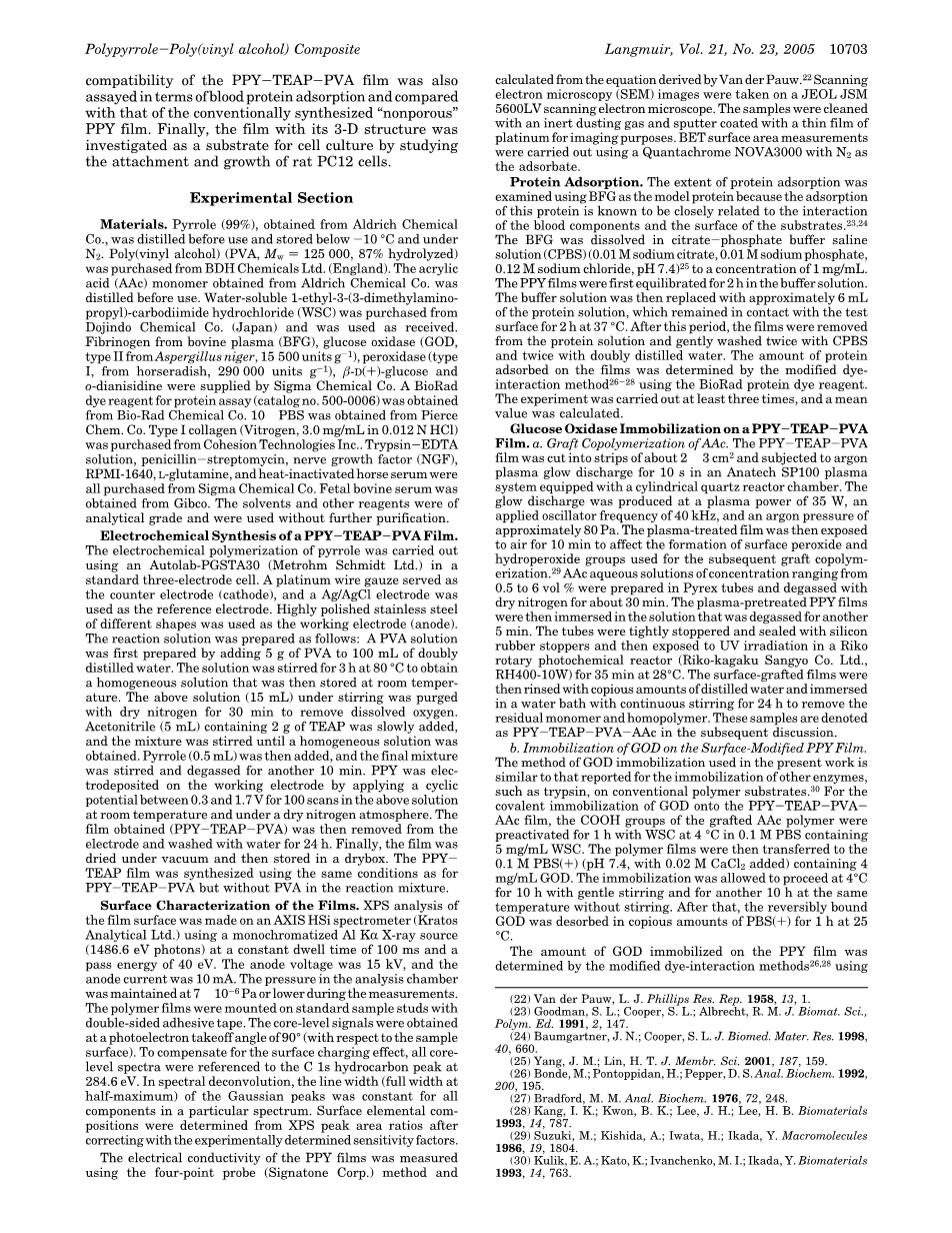 通过使用聚(乙烯醇)(PVA)批量修改聚吡咯(PPy),在存在PVA的反应液中发生吡咯电聚合反应,四乙胺高氯酸盐(TEAP)作为电解质。PPY-TEAP-PVA膜合成的表面形貌使用扫描电子显微镜进行了研究,然后这膜的更深层特征使用X射线光电子能谱,测出电导率,水接触角,和表面积测量。 PPY-TEAP-PVA复合材料具有导电性,亲水性和微孔,高比表面积。它具有作为生物材料在血液相容性方面的潜力以及作为生物传感和细胞培养基的功能。聚乙烯醇在膜中的存在减轻血液蛋白吸附,并且多孔性PPY-TEAP-PVA膜导致固定在一个无孔聚吡咯薄膜上的共价葡萄糖氧化酶的数量增加了10倍。与组织培养聚苯乙烯相比PC12细胞在PPY-TEAP-PVA膜上的粘附和生长也显示被加强。在48小时候后在单层膜的表面细胞粘附增殖形成。