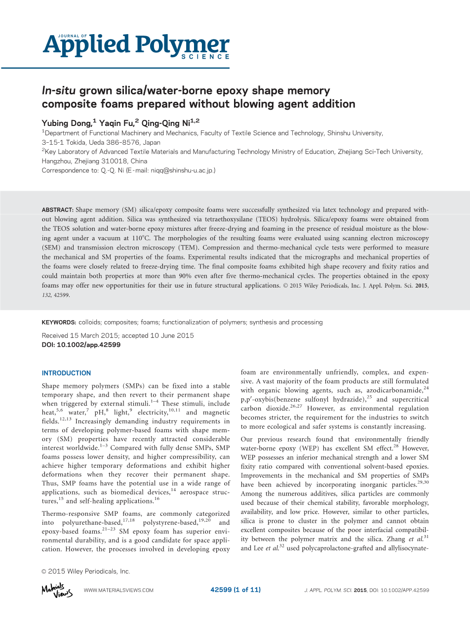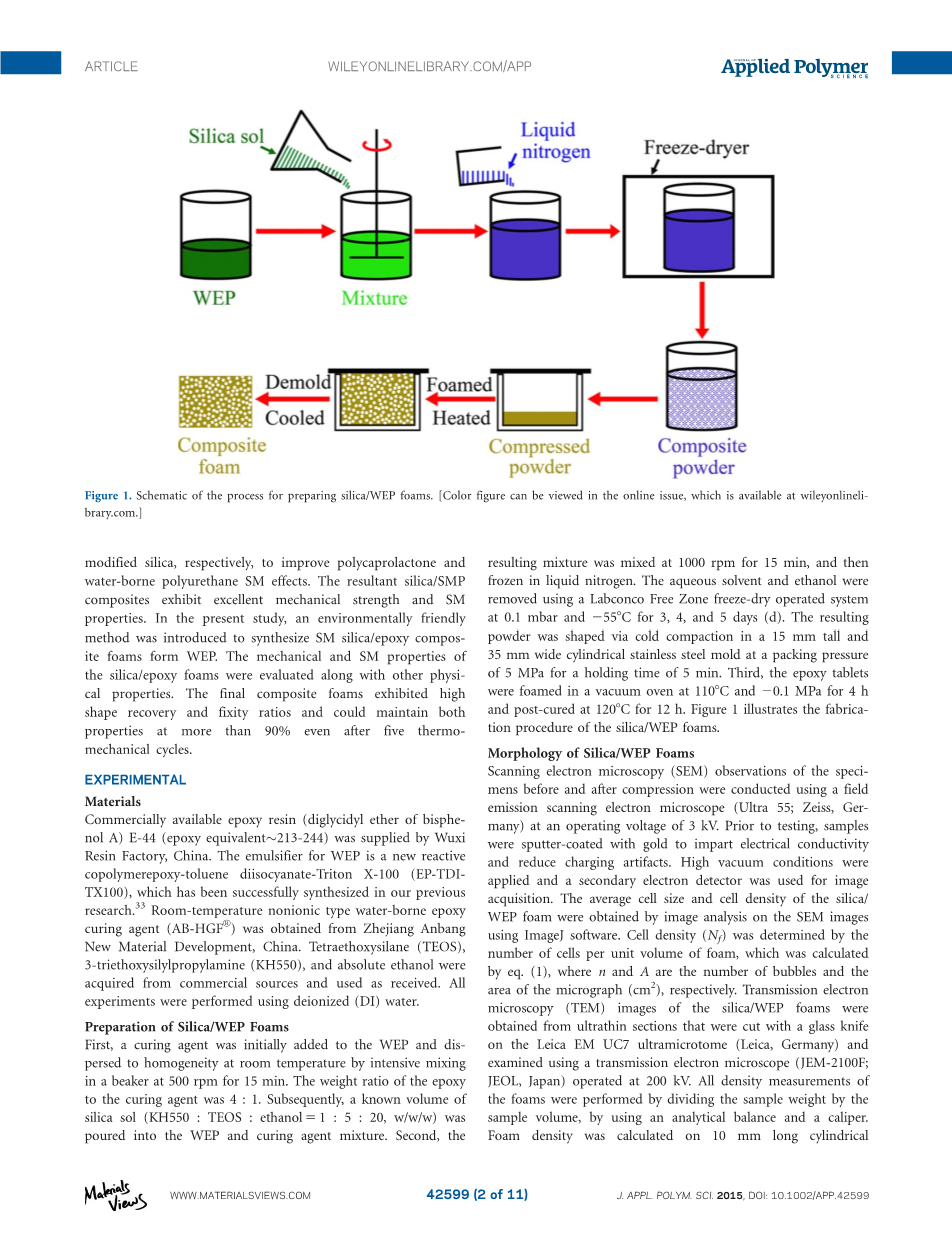 热响应型形状记忆聚合物泡沫通常被分类为聚亚胺酯型、聚苯乙烯型和环氧树脂型泡沫。形状记忆环氧树脂泡沫具有优良的环境持久性,以及具有很好的航空航天运用价值。但是,这些涉及开发环氧树脂泡沫的过程是环境不友好、复杂、以及昂贵的。泡沫产品的一大优势是利用有机发泡剂来合成,例如偶氮二甲酰胺、p,p-oxybis(benzene sulfonyl hydroxide),和超临界的二氧化碳。但是,随着环境监控变得日益严格,对工业界逐渐转向更经济安全的系统的要求也逐渐增加。我们之前的研究发现水性环氧树脂具有出色的形状记忆性能。但是,与传统的溶剂型环氧树脂相比,水性环氧树脂同时具有较差的机械强度和较低的形状记忆固定比例。在改善形状记忆聚合物的机械与形状记忆性能方面已经可通过掺入无机物达到。在众多的添加剂硅原子(particle在这个领域到底翻译成原子or粒子我不太确定哈,你自己看着调整)由于其化学稳定性、适宜的形态、易提取以及成本低廉的特性被广泛的应用。但是,与其他原子相同,硅原子易团聚在聚合物中,且因为其在聚合物基体和硅原子之间较差的界面相容性无法得到性能良好的复合材料。张和Lee等人曾分别用聚已酸内酯移植法和alkyls修饰二氧化硅去提高聚已酸内酯和水性聚亚胺酯的形状记忆效果。合成的硅/形状记忆聚合物复合材料展示出优异的机械强度和形状记忆性能。在目前的研究中,一种环境友好型的方法被用于合成形状记忆 硅/环氧树脂 复合泡沫类型的水性环氧树脂。最终的复合泡沫展示出很高的形状恢复性和固定率,甚至在五个热力学机械循环中有超过90%的复合泡沫仍可以保持这两种性能。