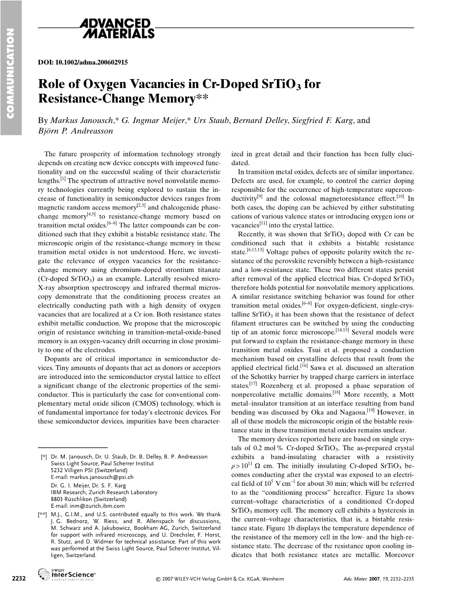 信息技术未来的繁荣在很大程度上取决于改进功能的新概念器件的开发以及它们自身特征长度的成功扩展[1]。更具吸引力的非易失性存储器系列在磁性随机存取存储器[2,3],硫族化物相变存储器[4,5]和过渡金素氧化物基阻变存储器之间变化[6–8]。非易失性存储器以保持半导体器件多功能化为目的,目前正在探索中。过渡金属氧化物基阻变存储器的化合物可以被调整以表现出电阻双稳态。但是这些过渡金属氧化物基阻变存储器的微观成因还不了解。这里,作为例子我们研究了Cr掺杂SrTiO3的阻变存储器中氧空位的意义。横向分辨微X射线吸收光谱和红外热显微镜证实该调整过程创造了导电路径,它的氧空位密度很高,并且氧空位主要在Cr离子周围的小范围内。电阻双稳态的两个电阻状态都表现出金属传导。所以,我们提出过渡金属氧化物基存储器中电阻切换的微观成因是,发生在其中一个电极附近氧空位的位移。