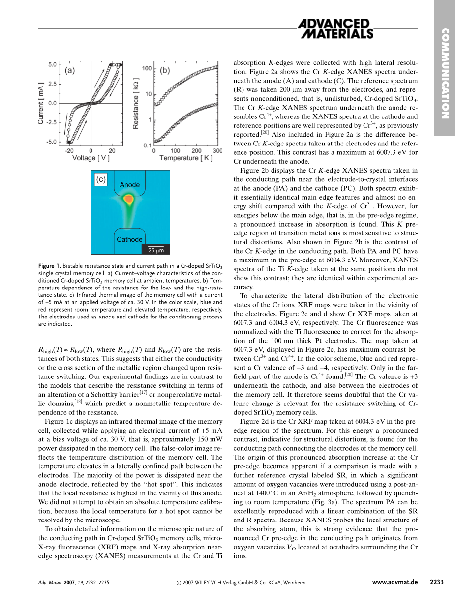 图1.Cr掺杂SrTiO3单晶存储器单元中的电阻双稳态和电流路径。a) 在环境温度下,调整过的Cr掺杂SrTiO3存储器单元的电流-电压特性。b) 高电阻和低电阻状态下电阻的温度依赖性。c) 在应用偏压ca.30V,电流 5mA时,存储器单元的红外热像。其中,蓝色和红色分别代表室温和升高的温度,显示了调整过程中的阳极和阴极。