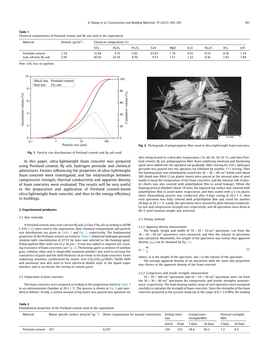 在实验中使用波特兰水泥和低钙飞灰(根据ASTMC 618 [13]的F类飞灰),它们的化学组成和粒度分布在表1和图2中给出。波特兰水泥的基本性质列于表2中。选择浓度为27.5质量%的工业过氧化氢溶液作为发泡剂。聚丙烯纤维的尺寸为ɸ 30mu;m * 9mm,以提高泡沫混凝土的抗开裂性(参见图2)。使用增稠剂(黄原胶,纤维素醚和可再分散乳液粉末的混合物)来增加糊料的稠度和泡沫混凝土中气隙的壳厚度。泡沫稳定乳液(由硬脂酸(CH 3(CH 2)16 COOH),NaOH,KOH和氨合成)也用于在液体 - 蒸气界面处形成双电层并加速水泥糊的凝固。