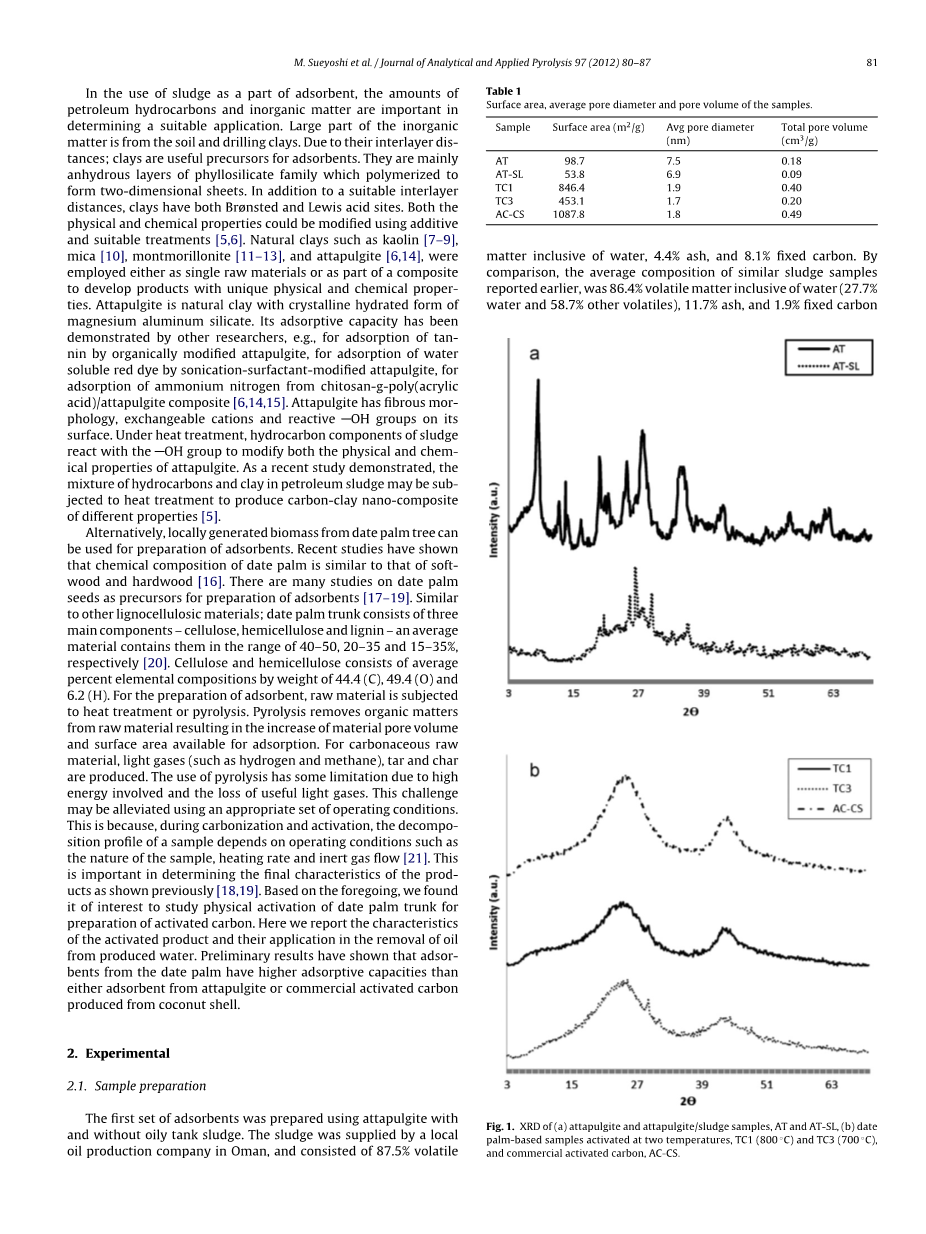 第一组吸附剂用凹凸棒土准备,没有用油底污泥。油底污泥由阿曼当地石油生产公司提供,由87.5%含水挥发物、4.4.%灰和8.1%固定碳组成。相比之下,报道更早些的相似污泥样品平均成分为,86.4%含水挥发物(27.7%水和58.7%挥发物)、11.7%灰和1.9%的固定碳[4].