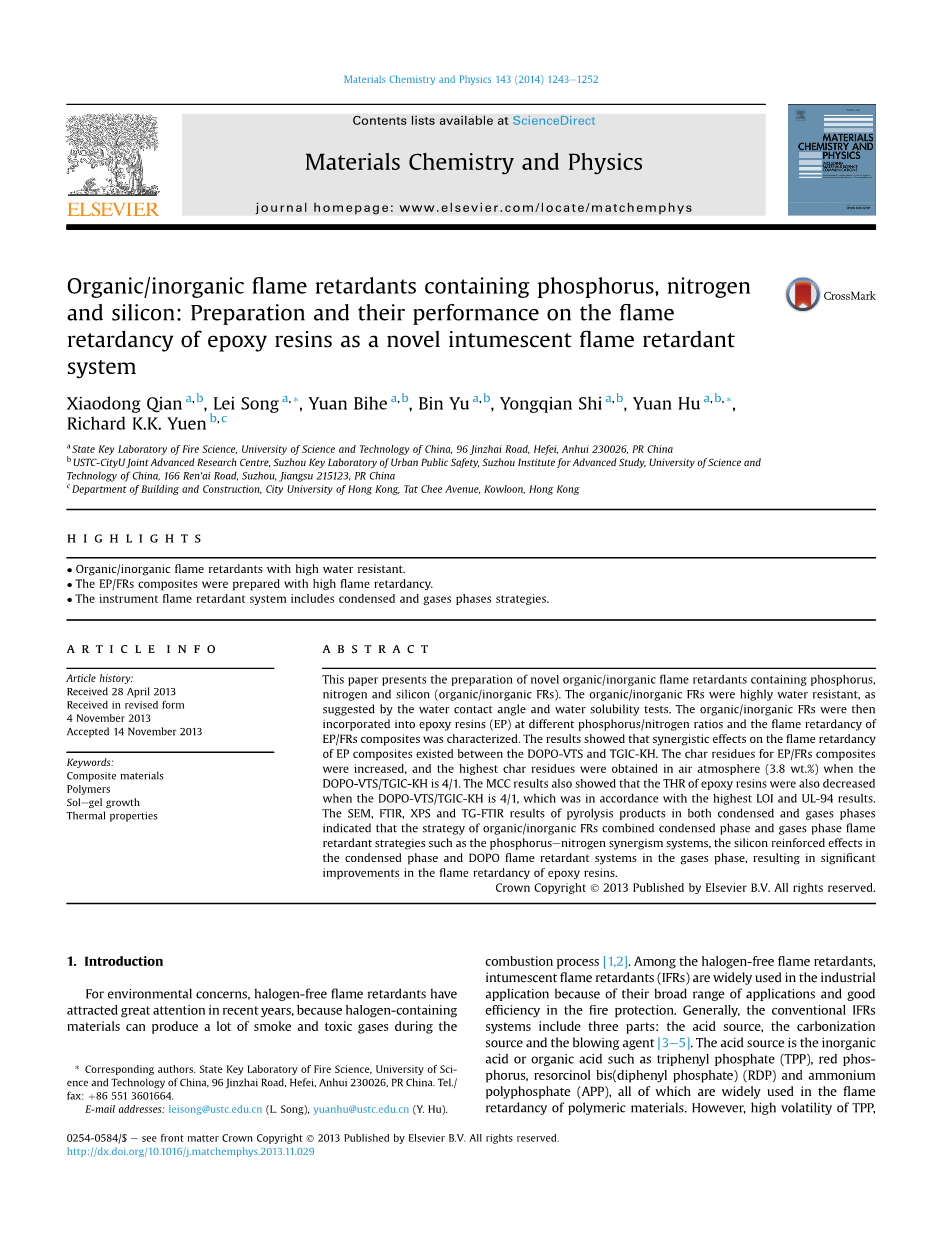 摘要 本文介绍了含磷、氮、硅的有机/无机阻燃剂的制备方法。通过与水的接触角测试和水溶解性测试,该有机/无机阻燃剂是超疏水的。将不同磷氮比的有机/无机阻燃剂加入到环氧树脂中,制成环氧/有机/无机阻燃剂复合材料,然后对其阻燃性能进行表征。结果表明,环氧树脂的阻燃剂中DOPO-VTS(一种含磷和硅的液态硅烷阻燃剂)和TGIC-KH(异氰尿酸三缩水甘油酯溶解到N,N-二甲基甲酰胺减压蒸出溶剂得到的无色粘稠液体)存在协同效应。环氧/阻燃剂复合材料的碳残留量增加。在氧气质量分数为3.8%的气体中,当DOPO-VTS/TGIC-KH为4/1时,环氧/阻燃剂复合材料的碳残留量最高。微型燃烧量热仪(MCC)结果也表示,当DOPO-VTS/TGIC-KH为4/1时,环氧树脂的总放热量减少。这与极限氧指数(LOI)和UL-94防火等级规范测试结果相符。热解产生的固相和气相产物的扫描电镜(SEM)、傅里叶变换红外光谱(FTIR)、X射线光电子能谱(XPS)和热重分析-傅里叶红外光谱联用(TG-FTIR)分析结果表示,有机无机杂化阻燃剂的机理结合了固相和气相阻燃机理。例如,磷-氮体系、硅增强固相效果,DOPO阻燃体系在气相产生效果,以上共同作用导致环氧树脂的阻燃性得到很大的提高。