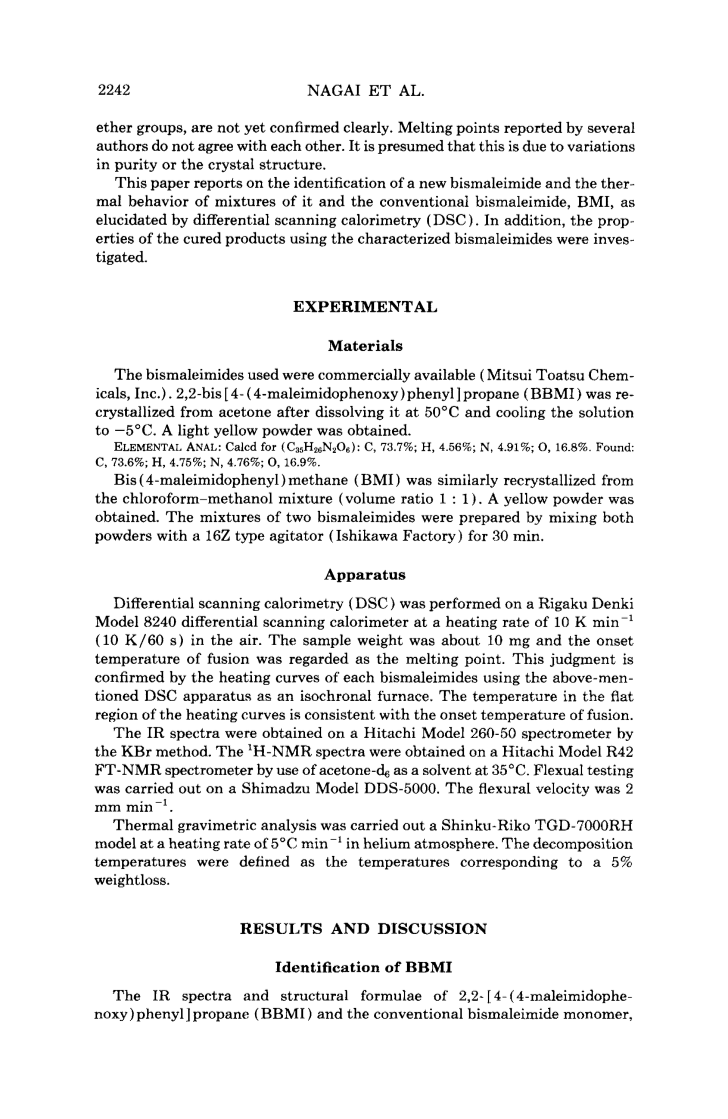 用差示扫描量热法对一种新型双马来酰亚胺,2-2-苯丙烷双马来酰亚胺性能进行研究。BBMI的熔点是142℃,比BMI低,尽管他的分子质量几乎是BMI的2倍。每种双马来酰亚胺和他们的混合物在加热时只有一个熔点,但是在玻璃化冷却过程中并没有一个可区别的冰点,利用这两种双马来酰亚胺的熔点和融化热,基于施罗德的方程计算得到不明显的冰点曲线。BBMI的固化物的热稳定性和BMI一样好,而且BBMI的固化物有很高的挠度强度(弯曲强度),和高的韧性延伸,这是由于引入了韧性的醚键和长的苯基团单体结构。