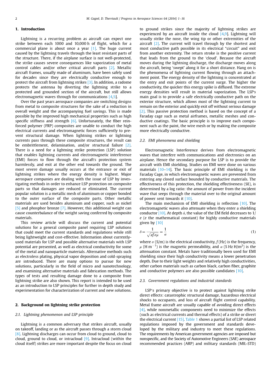 LSP的主要目的是防止雷击产生的直接影响:灾难性的结构损坏,雷电对人的伤害,和很多雷电对飞机控制能力的影响。金属框架飞机通常能够避免直接影响[4],而非金属部件需要尽量减少冲击或转移的影响(如电气电流和热效应)[ 15 ],表1显示LSP的部分清单,相关规定是由政府征收标准发展的军事和工业的法规。该规定满足美国政府机构的要求,但不是很具体,其中还包括汽车工程师协会(SAE)航天推荐做法(ARP)和军用标准(MIL-STD)。