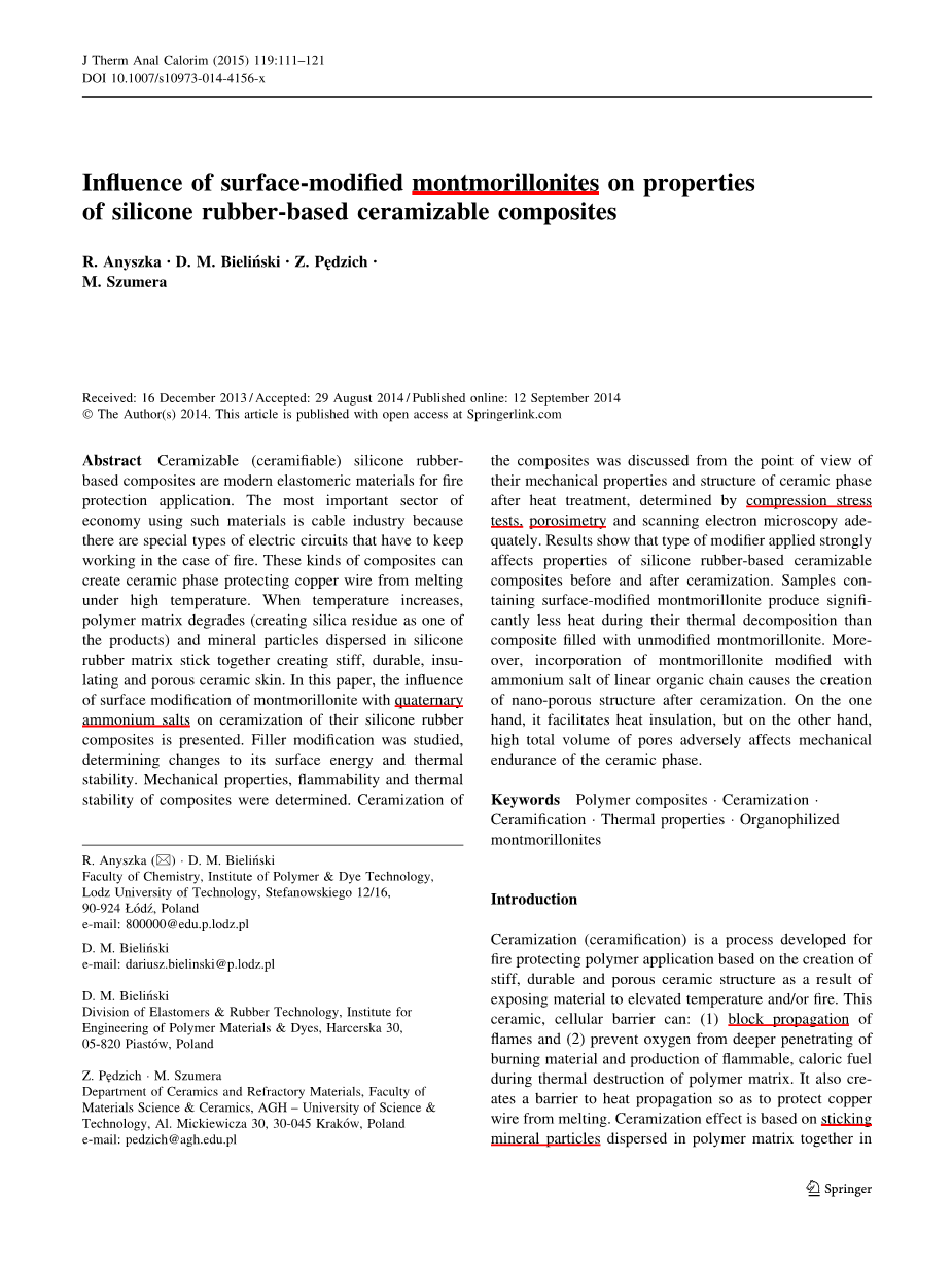 摘要:可瓷化硅橡胶基复合材料是现代防火弹性材料。电力这种重要的部门使用这种材料是其可以保证电子电路在火灾发生的情况下正常工作。这些类型的复合材料能在高温下生成陶瓷相保护铜线不被融化。在温度升高时,聚合物基质降解(硅橡胶形成聚硅氧烷)和矿物颗粒粘结在一起形成坚硬,耐用,绝缘,多孔的陶瓷表层。在本文中,提出表面改性蒙脱土对硅橡胶基可瓷化复合材料的影响。填料的改性决定其其表面能和热稳定。本文测定了复合材料机械性能,可燃性和热稳定性。在热处理后,通过压应力测试和扫描电子显微镜,孔隙度测试对可瓷化复合材料机械性能和结构进行分析。结果表明,改性剂的类型对陶瓷化后的硅橡胶基复合材料的性能影响很大。含有表面改性蒙脱土的硅橡胶样品在热分解过程中需要的热量比含有未表面改性蒙脱土的样品要显著变少。此外,表面改性蒙脱土掺入含有线性有机链的铵盐可以使陶瓷化后产生纳米多孔结构。一方面,这有利于隔热,另一方面,毛孔总容积变大对陶瓷相的机械应力有不好的影响。