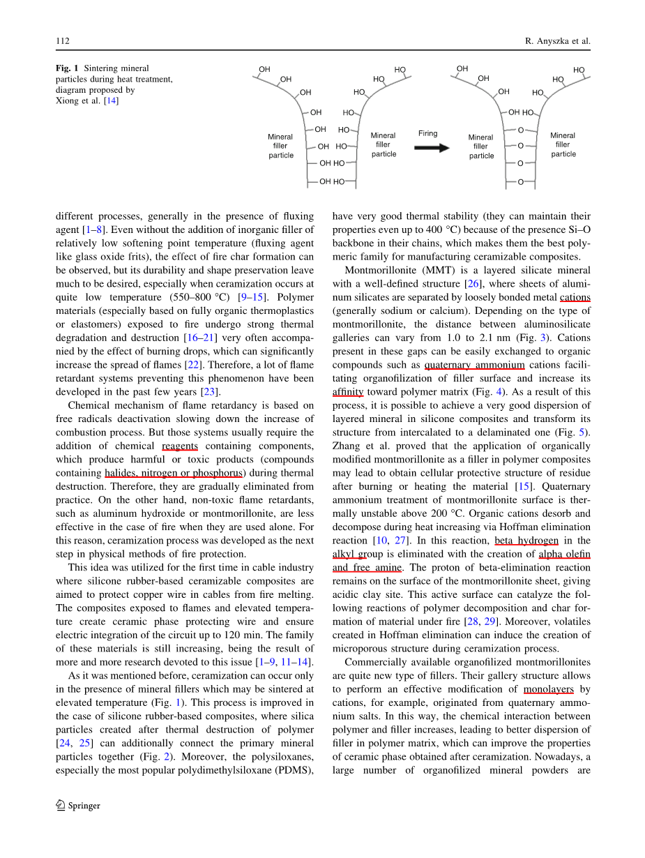 蒙脱石(MMT)是一种明显的层状结构的硅酸盐矿物[26],其中的铝硅酸盐层明显的呗松散结合的金属阳离子分离(一般是钠或者钙)。不同类型的酸盐层之间的距离在1.0到2.1纳米彼变化(图3)。存在在这些间隙的阳离子可以很容易的替换成有机物,如季铵盐阳离子对其表面改性使其变得亲聚合物基质(图4)。这一过程的结果是矿物层能够很好地分散在硅橡胶里,而不是以分层的形式插入其中(图5)。张某等人证明,合理的使用改性蒙脱土作为高分子复合材料的填料可以使加热或烧蚀该材料后的残余物形成保护结构[15]。季铵盐改性蒙脱土在200℃以上热不稳定,有机阳离子在热分解过程中吸热增加霍夫曼消除反应[10,27]。在该反应中,烷基中的活泼氢被alpha;-烯烃和游离胺取代。beta;-取代反应的质子仍然在蒙脱土片的表面上,使酸性白土站点。在火灾中,这种活泼表面可以催化高分子材料的热解和成炭反应[28,29]。此外,霍夫曼消除反应产生的气相挥发物可以在陶瓷化过程中生成微孔。