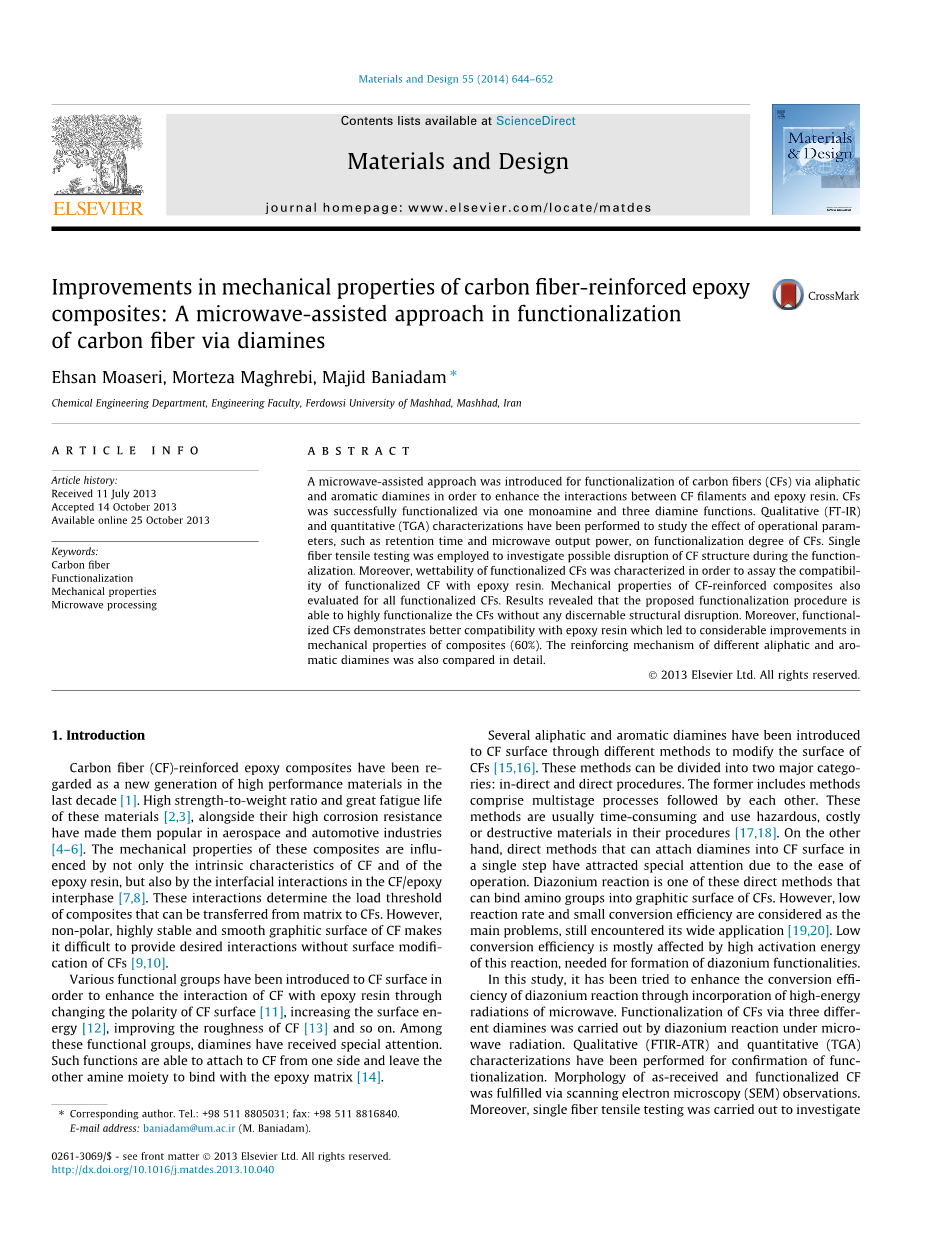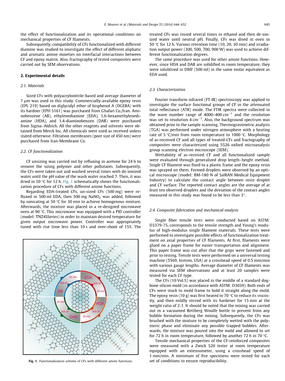 微波辅助功能程序已经被用于二胺官能化碳纤维的过程。这一过程是通过三种二胺和一种一元胺进行,并通过TGA测试和FT-IR光谱测量验证。通过这一过程实现了显著的高官能化程度。单纤维拉伸试验表明,这一过程是非破坏性的,官能化过程是在没有明显损伤的情况下发生。二胺与碳纤维的官能化使碳纤