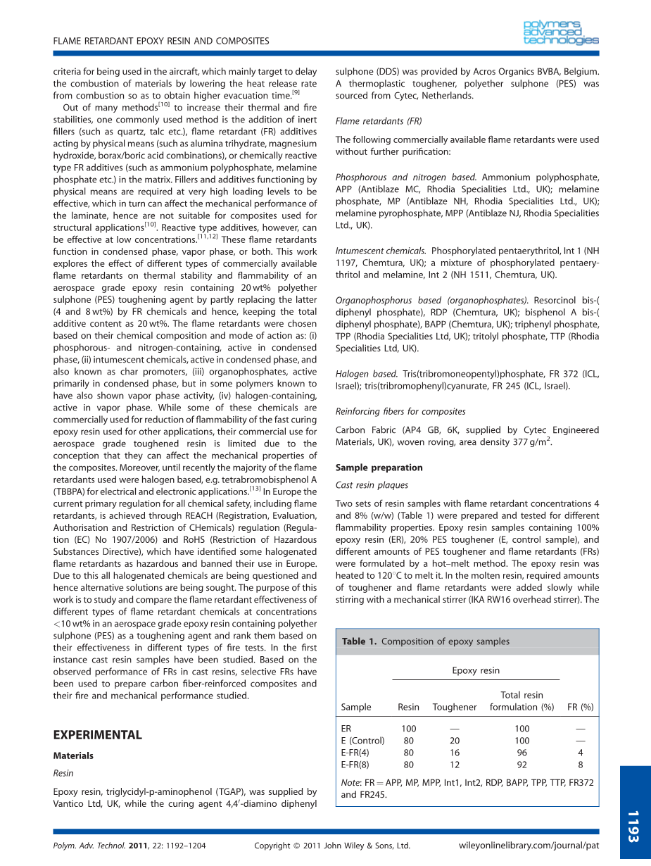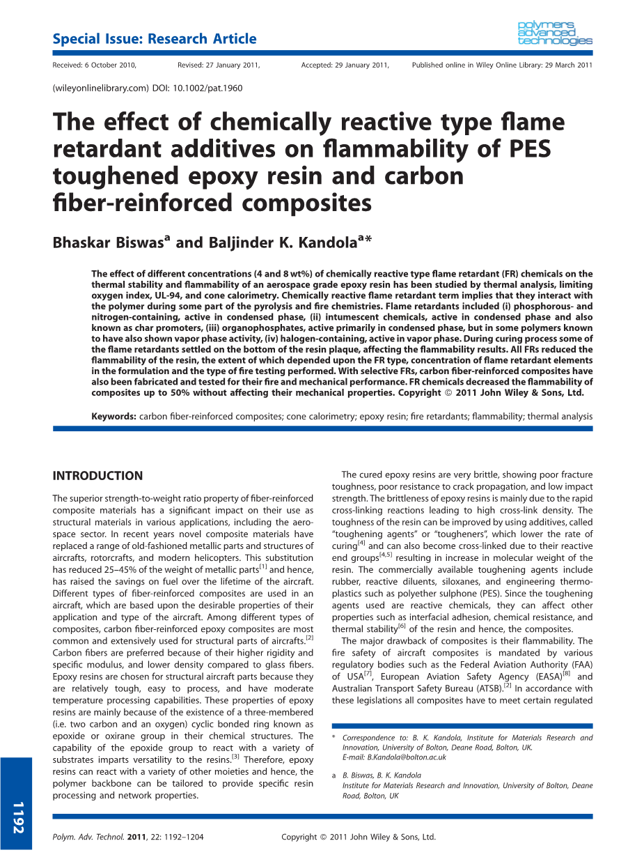 添加剂含量为20wt%。阻燃剂基于它们的化学组成和作用模式选择为:(i)含磷和氮的,在凝相中具有活性的(ii)膨胀化学品,在冷凝相中具有活性,并且也称为焦化促进剂, iii)有机磷酸酯,主要在缩合相中活化,但在一些已知具有气相活性的聚合物中,(iv)含卤素,在气相中具有活性。虽然这些化学品中的一些商业上用于降低用于其它应用的快速固化环氧树脂的可燃性,但是由于它们可以影响复合材料的机械性能,因此它们在航空级增韧树脂的商业用途受到限制。此外,直到最近,所使用的大多数阻燃剂是基于卤素的,例如。四溴双酚A(TBBPA)用于电气和电子应用。 [13]在欧洲,目前所有化学品安全的主要法规,包括阻燃剂,通过REACH(注册,评估,授权和限制法规)法规(法规(EC)No 1907/2006)和RoHS的有害物质指令), 已经确定一些卤化阻燃剂是危险的,并禁止其在欧洲使用。由于这一点,所有的卤化化学品都受到质疑,因此寻求替代解决方案。本研究的目的是研究和比较含有聚醚砜(PES)作为增韧剂的航空航天级环氧树脂中不同类型阻燃化学品在浓度lt;10wt%时的阻燃效果,并根据它们的有效性对其进行排名不同类型的防火测试。在第一种情况下,已经研究了浇注树脂样品。基于观察到的FR在铸塑树脂中的性能,选择性FR已被用于制备碳纤维增强复合材料和它们的火和机械性能研究。
