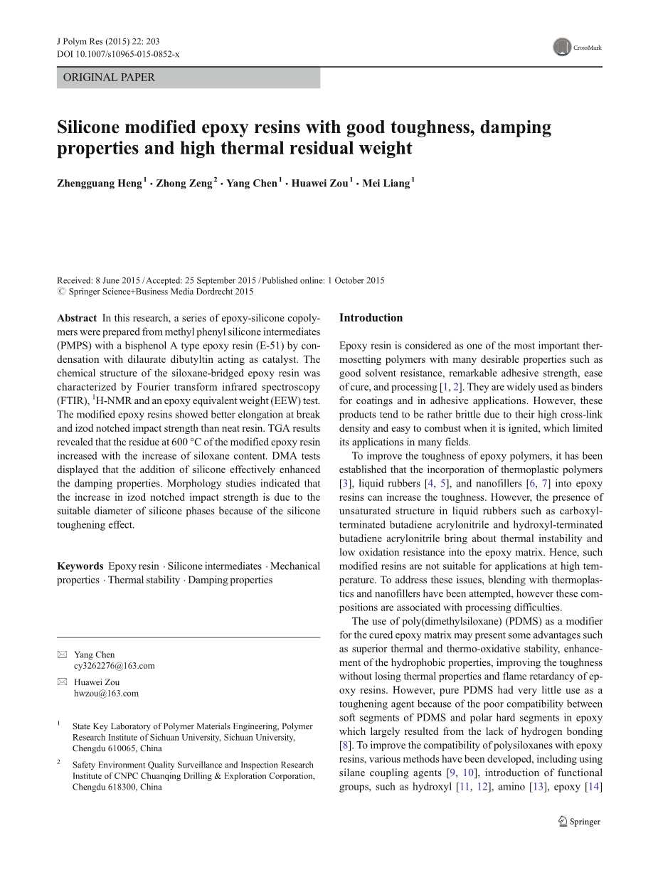 有机硅改性环氧树脂具有良好的韧性、阻尼性能和高的热残余量外文翻译资料