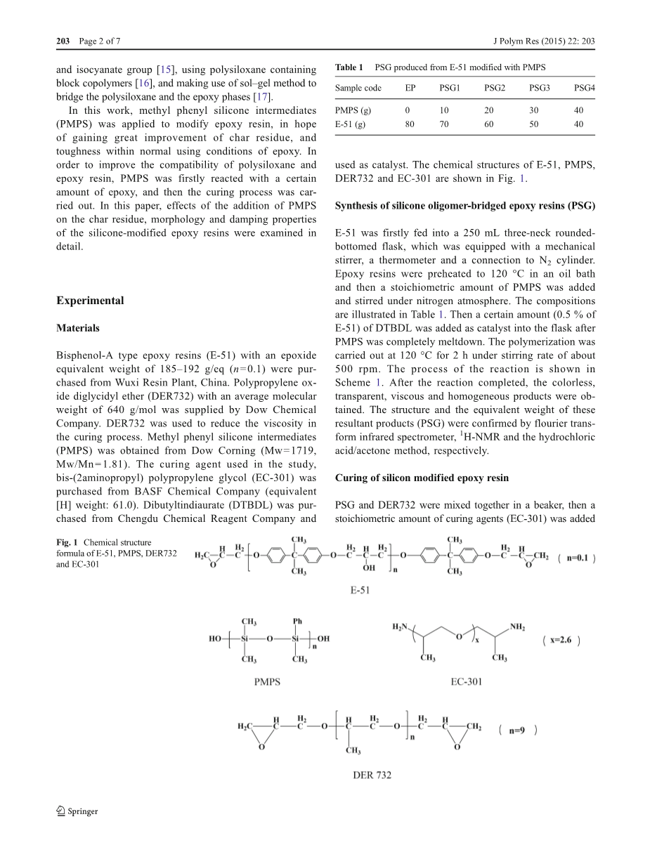 环氧当量为185-192g/eq(n = 0.1)的双酚A型环氧树脂(E-51)购自中国无锡树脂厂。陶氏化学公司提供平均分子量为640g /mol的聚环氧丙烷二缩水甘油醚(DER732)。DER732用于降低固化过程中的粘度。甲基苯基硅氧烷中间体(PMPS)得自道康宁公司(Mw = 1719,Mw / Mn = 1.81)。研究中使用的固化剂,双(2-氨基丙基)聚丙二醇(EC-301)购自巴斯夫化学公司(当量[H]重量:61.0),二丁基丁酸钠(DTBDL)购自成都化学试剂公司,用作催化剂。 E-51,PMPS,DER732和EC-301的化学结构如图1所示。