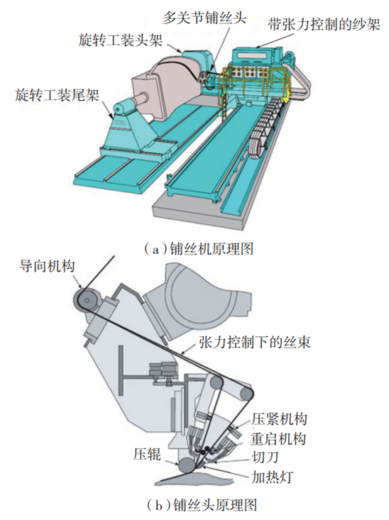 变刚度复合材料层合板通常是通过自动铺丝技术得到的。自动铺丝技术是指在多坐标自动铺丝机的控制下,铺丝头将多束预浸丝束通过放卷、导向、传输、压紧、切割、辊压等功能在压辊下集束成带,并按照计算机规划的轨迹进行铺层的自动化铺放。在铺放过程可实现预浸丝束的单独控制,实现增减丝束,并可实现转弯铺放[4]。自动铺丝设备如图所示。