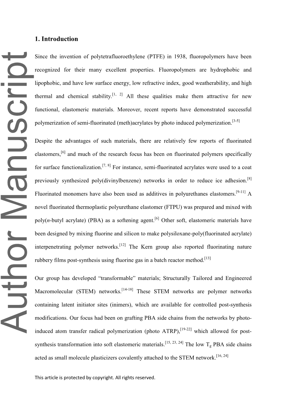 尽管这种材料有很多优点,但关于含氟弹性体的报道相对较少[6],许多研究重点一直是氟化聚合物,专门用于表面功能化[7,8]。例如,半氟化丙烯酸酯被用于涂覆先前合成的聚(二乙烯基苯)网络,以减少冰的粘附[8]。氟化单体也被用作聚氨酯弹性体的添加剂[9-11]。制备了一种新型的含氟热塑性聚氨酯弹性体(FTPU),并与聚丙烯酸正丁酯(PBA)作为软化剂进行了混合。其他软弹性材料已经设计通过混合氟和硅,使聚硅氧烷-聚(氟化丙烯酸酯)互穿聚合物网络[12]。 克恩集团还报告了在间歇反应器中使用氟气体进行合成后的氟化天然橡胶薄膜方法[13]。