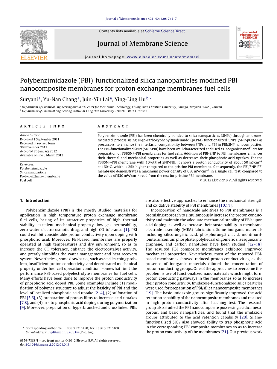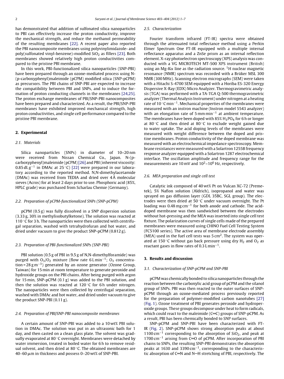 聚苯并咪唑(PBI)因为其稳定的高导热性能,优异的机械性能,低透气性,零水电渗透阻力以及高的CO耐受性,所以是高温质子交换膜燃料电池主要研究的材料。PBI掺杂磷酸时可以表现出相当大的质子传导率。此外,基于PBI的膜可以在高温和干燥的环境中操作,增加CO耐受性,提高电催化剂的活性,并大大简化了的水管理和热回收系统。尽管如此,一些缺点,如酸浸问题,质子传导性不充分,在燃料电池的操作环境下机械性能变差的属性,会限制PBI用于燃料电池的电解质膜。 可以通过以下方式提高磷酸掺杂PBI膜的质子传导性:(1)通过聚合物结构的修改来调整PBI在碱性环境的局部磷酸摄取,(2)提高PBI的磺化水平,(3)制备多孔膜,以增加酸喉管的制备,(4)原位聚合过程中磷酸掺杂。此外,制备超支化和交联也能提高机械强度和PBI膜的氧化稳定性。纳米添加剂掺入PBI膜是一种有希望来同时提高质子传导性和维持机械、氧化稳定性的方法,以及提高他们的可持续性膜电极组件(MEA)的制造。有些已经研究过的掺杂到PBI中的无机材料包括;硅钨酸,磷钨酸,蒙脱石,磷酸锆,多面体低聚倍半硅氧烷,石墨烯,碳纳米管,都使得PBI膜的机械性能有所提高。然而,大多数报道的PBI膜的具有质子传导率降低的问题。有研究者使用能在膜中形成质子传导通路的功能化纳米材料,以便增加其质子传导性。例如在PBI中加入咪唑官能化的二氧化硅颗粒制备PBI /二氧化硅纳米复合膜,以提高其质子传导率。此外,他们还还研究了PBI纳米复合材料具有酸性,中孔,和基本的纳米颗粒,发现了咪唑基能保持酸不流失,功能化二氧化硅也表现出能够捕获磷酸的能力。我们以前的工作已经证明,除了磺化二氧化硅纳米粒子得到PBI能有效增加质子导电性,提高的机械强度,并降低甲醇渗透性。最近的一篇文章也报道使用PBI纳米复合膜和聚(磺化乙烯基 - 苯)改性二氧化硅作为填料[23],相比纯PBI膜,都表现出相对较高的质子导电率,在这项工作中,通过臭氧介导过程,以N-(p-羧基苯基)马来酸酐(pCBM)功能化二氧化硅纳米粒子作为前驱体,将PBI化学键合到了二氧化硅纳米粒子上,制备出SNP-PBI。SNP-PBI的PBI链有望增加PBI和SNP之间的相容性,并诱导质子传导通道在膜中形成[24,25],制备出了PBI/ SNP-PBI纳米复合材料的质子交换膜。实验表明,在PBI/SNP-PBI膜已经表现出改善的机械强度,高质子传导率,以及单电池的性能相比纯PBI膜都有提高。
