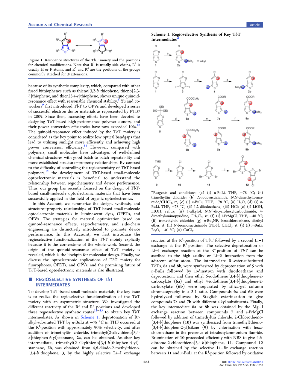 TbT的R 4位上的选择性去质子化或Li-I交换反应可归因于来自相邻硫原子的高酸度或Li-S相互作用。8a和8b通过用n-BuLi使5脱质子化,然后用二碘乙烷碘化并脱保护,然后将6-碘噻吩并[3,4-b]噻吩-2-甲酸乙酯合成中间体R1-酯 - 取代的TbTs, (6a)和4-碘噻吩并[3,4-b]噻吩-2-甲酸乙酯(6b)通过硅胶柱色谱法以3:1的比例分离。将化合物6a和6b水解,接着进行Steglich酯化,得到具有不同烷基取代基的化合物7a和7b。最后,通过化合物7与i-PrMgCl之间的Mg-I交换反应,随后加入三甲基氯化锡,获得关键中间体8a或8b。在四丁基氟化铵存在下,通过用六氯乙烷氯化由三甲基(噻吩并[3,4-b]噻吩-2-基)硅烷(9)合成2-氯噻吩并[3,4-b]噻吩 .10的溴化用NBS有效地进行,得到4,6-二溴-2-氯噻吩并[3,4-b]噻吩,11。化合物12可以通过11和n-BuLi在R 4 - 位置之间的选择性Li-Br交换反应,然后与氯化铜(II)氧化同时偶联来获得。 基于这些高度区域选择性的合成路线,我们设计并合成了一系列新的基于TbT的小分子光电子材料,并将其应用于有机电子学中,总结如下。