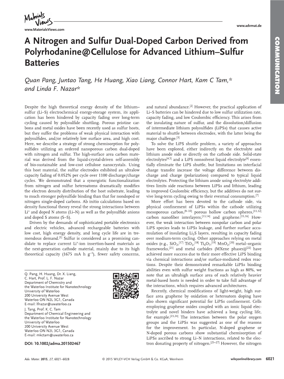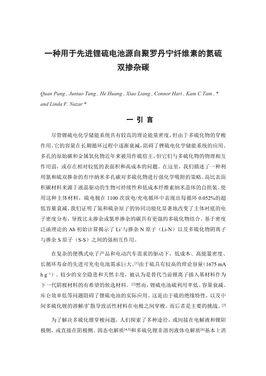 一种用于先进锂硫电池源自聚罗丹宁纤维素的氮硫双掺杂碳外文翻译资料