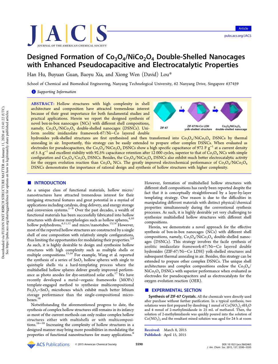 设计具有增强的赝电容及电催化性能的Co3O4/NiCo2O4双壳纳米笼结构