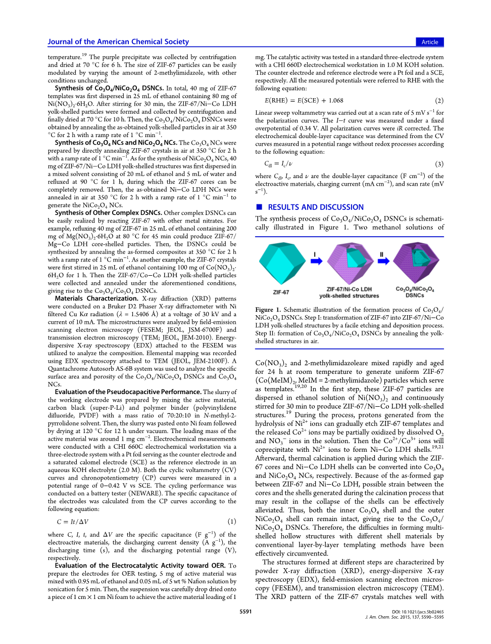 作为一类独特的功能材料,中空微/纳米结构引起了人们极大的兴趣。有趣的结构特征和巨大的潜力在无数应用包括催化、药物输送和能量储存和转换系统。在过去的几十年中,大量功能材料已成功制成空心且具有不同形态的结构,例如空心球体,空心多面体和微/纳米管。但是,大多数报道的空心结构是由一个单一的具有相对简单配置的外壳组成,从而限制了调整其属性的机会。因此,非常迫切需要设计和合成空心具有高度复杂性的结构,例如多个壳或多种组合物。例如,Wang 等人报道了通过硬模板工艺合成一系列具有单壳至五壳的SnO2空心球,其中多壳空心球作为染料敏化太阳能电池的光阳极具有显著改善的性能。 我们有最近开发了一种金属有机框架(MOFs)模板接合方法,用于合成多成分Fe2O3minus;SnO2 微盒,其表现出比单壳更好的锂存储性能。尽管迄今为止取得了上述进展,但复杂空心结构的合成仍处于起步阶段,由于目前的大多数方法只能实现复杂的空心多壳结构或多组分结构。增加空心结构复杂性的设计方式会带来更多的可能性,可以用于调节功能性纳米结构的特性。然而,具有不同壳组成的多壳空心结构的形成很少被报道,尽管事实上通过逐层的模板策略在概念上是直接的。一个原因是由于难以处理具有不同物理/化学方性质的不同材料。因此,合成具有不同壳组成的多壳中空结构是非常理想的,但也是非常具有挑战性的。在此,我们展示了一种有效合成具有不同的外壳的盒中盒纳米笼 (NCs) 的新方法,即Co3O4/NiCo2O4 双壳纳米笼(DSNCss)。该策略包括简单的合成沸石咪唑酯骨架-67/Ni-Co层状双氢氧化物(ZIF-67/Ni-Co LDH)独特的壳结构,随后在空气中进行热退火。另外,该策略可以扩展到制备其他复杂的 DSNCs。独特的外壳结构和复杂的组成使得 Co3O4/NiCo2O4 DSNCss 在作为赝电容器电极和析氧反应(OER)的电催化剂时具有优异的性能。