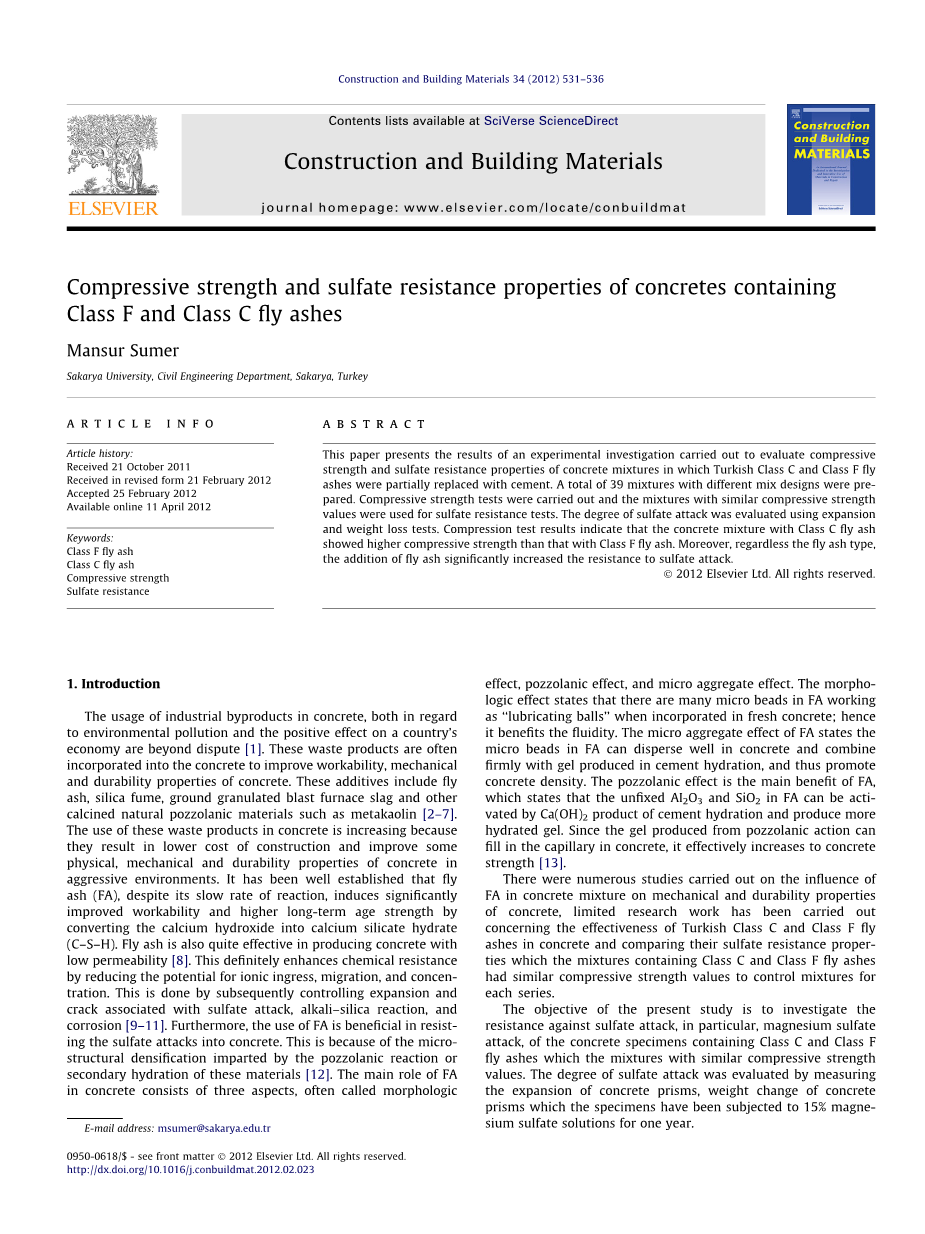 含F级和C级粉煤灰混凝土的抗压强度 和抗硫酸盐侵蚀性能外文翻译资料