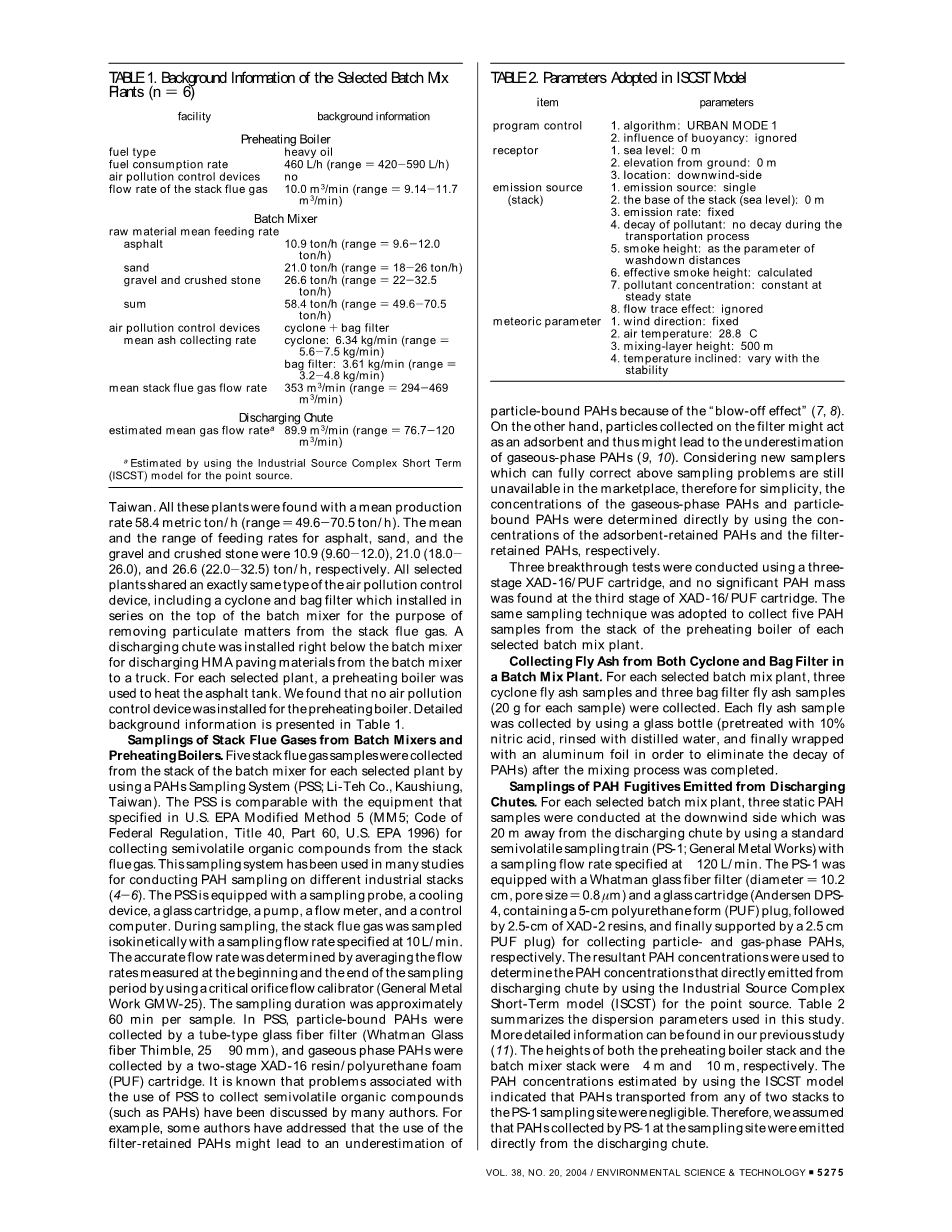 从卸料槽中排放的PAH难以捕捉的样品。对于每个选择的间歇式拌合器,要把取样流动速率控制在120 L/min后用标准的半挥发性取样车(PS-1,GMW)在离卸料槽20 m外的下风侧收集三个静态的PAH试样。PS-1装备有Whatman玻璃纤维过滤器(直径10.2 cm,孔径0.8 mu;m)和一根玻璃管(Andersen DPS-4,含有一个5cm的PUF塞,一个2.5cm的XAD-2树脂,然后用2.5cm的PUF塞支撑起来),用来分别收集颗粒态和气相的PAHs。曾认为是决定PAH浓度的合PAH浓度实际是用工业源短期复合模型(ISCST)来预估卸料槽的直接排放。表2总结了总结了研究中所用到的扩散参数。更多详细信息可以在我们之前的研究中找到[11]。预热炉烟道和间歇式拌合器的烟道高度分别为4 m和10 m。用ISCST模型预估的PAH浓度表明了PAHs从两个烟道中的任意一个运输到PS-1的取样点的损失都可以忽略不计。因此,我们可以假设PS-1的取样点所收集的PAHs都是直接从卸料槽中排放出来的。
