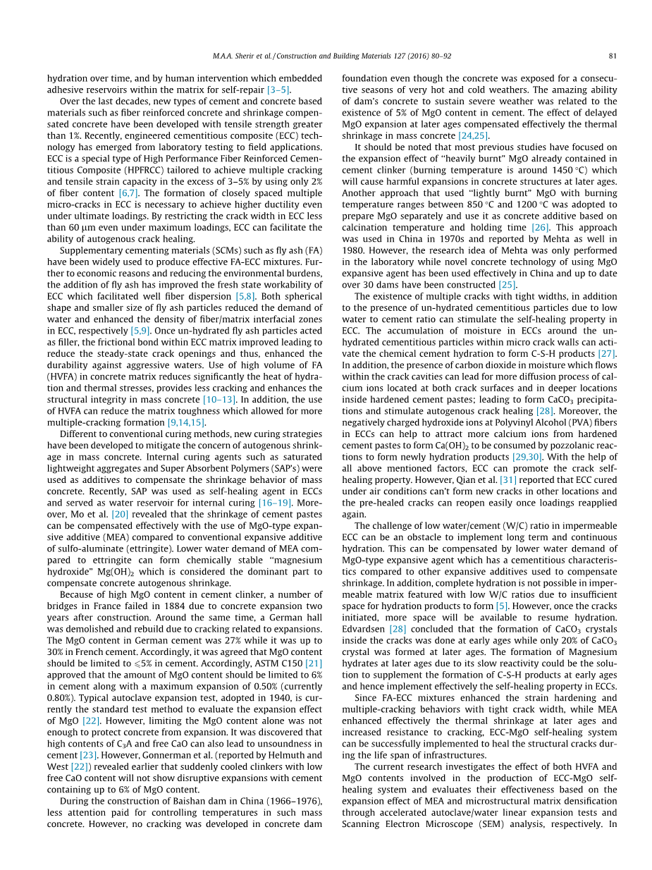 在不可渗透的ECC中,低水灰比(W / C)是实现长期和连续水合的障碍,可通过MgO型膨胀剂的较低需水量来补偿,与其它膨胀性添加剂相比,MgO型膨胀剂具有水泥特性。 此外,由于水合产物不足以形成的空间[5],低水灰比(W / C)的不可渗透基质中不能完全水合,然而,一旦裂纹开始,更多的空间将可用于恢复水合。Edvardsen [28]得出结论,在裂缝内CaCO3晶体的形成是在初期进行的,而在随后的龄期仅形成20%的CaCO3晶体。由于其缓慢的反应性,镁晚期的水化产物的组成溶解形成早期C-S-H产物,因此有效地实现ECC中的自愈合性质。