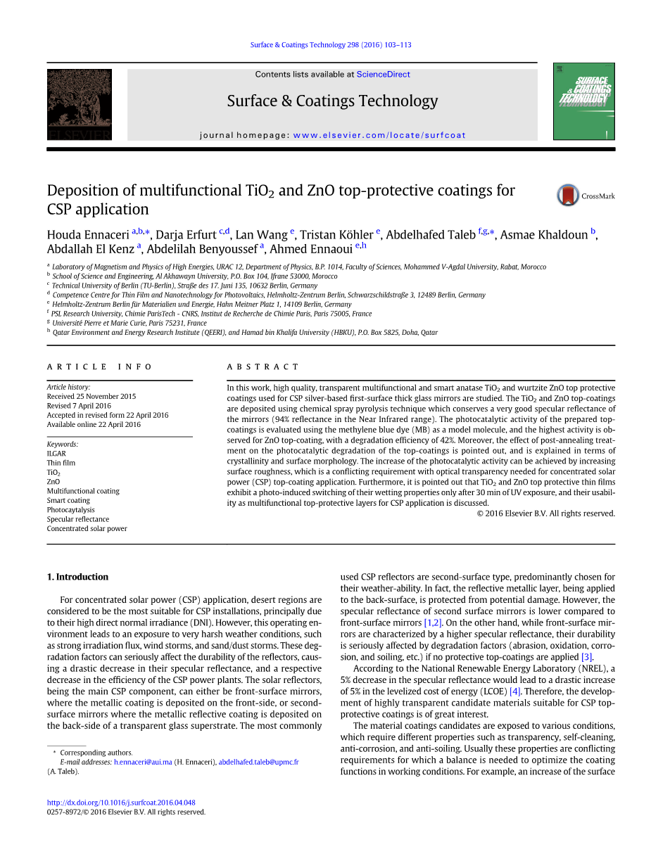 Houda Ennaceri a,b,⁎, Darja Erfurt c,d, Lan Wang e, Tristan Kouml;hler e, Abdelhafed Taleb f,g,⁎, Asmae Khaldoun b, Abdallah El Kenz a, Abdelilah Benyoussef a, Ahmed Ennaoui e,h