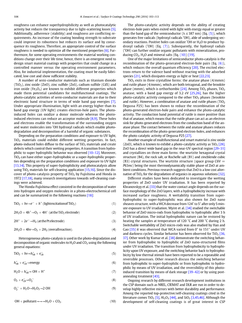 这种超亲水性和光催化性质是的TiO2材料用于自清洁设施[15,16]。自Fujisima和Honda于1972年发现TiO2的光催化性能以来,人们对自清洁涂层进行了许多研究。