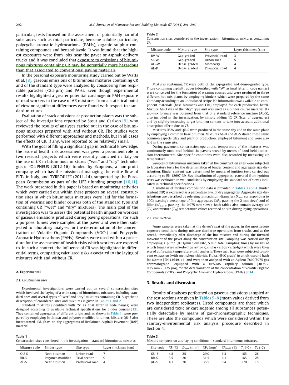 在几个施工现场所进行实验研究涉及沥青混合物的铺设宽度范围,包括施工标准以及几种类型的含有CR的“湿”和“干”的沥青混合物。 合成所考虑的位点和沥青混合物的描述在表1和2中给出。