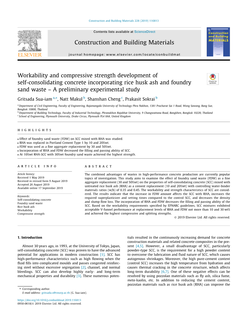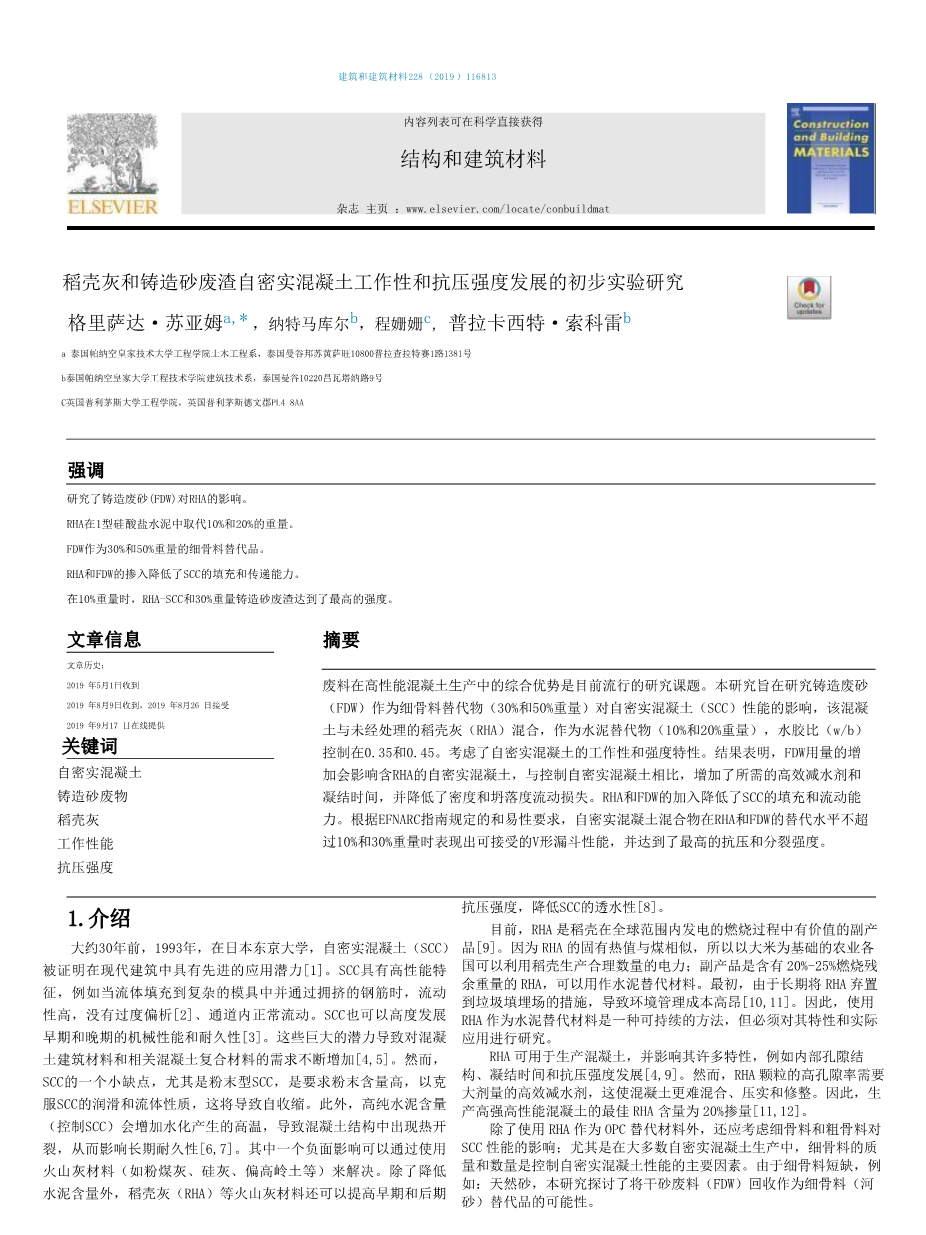 稻壳灰和铸造砂废渣自密实混凝土工作性和抗压强度发展的初步实验研究外文翻译资料