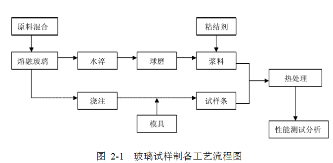 本实验所研究的中高温固体氧化物燃料电池用封接材料为微晶玻璃,以BaO- CaO- Al2O3- SiO2作为基础玻璃体系,制备过程采用传统的玻璃制备工艺,如图2-1: