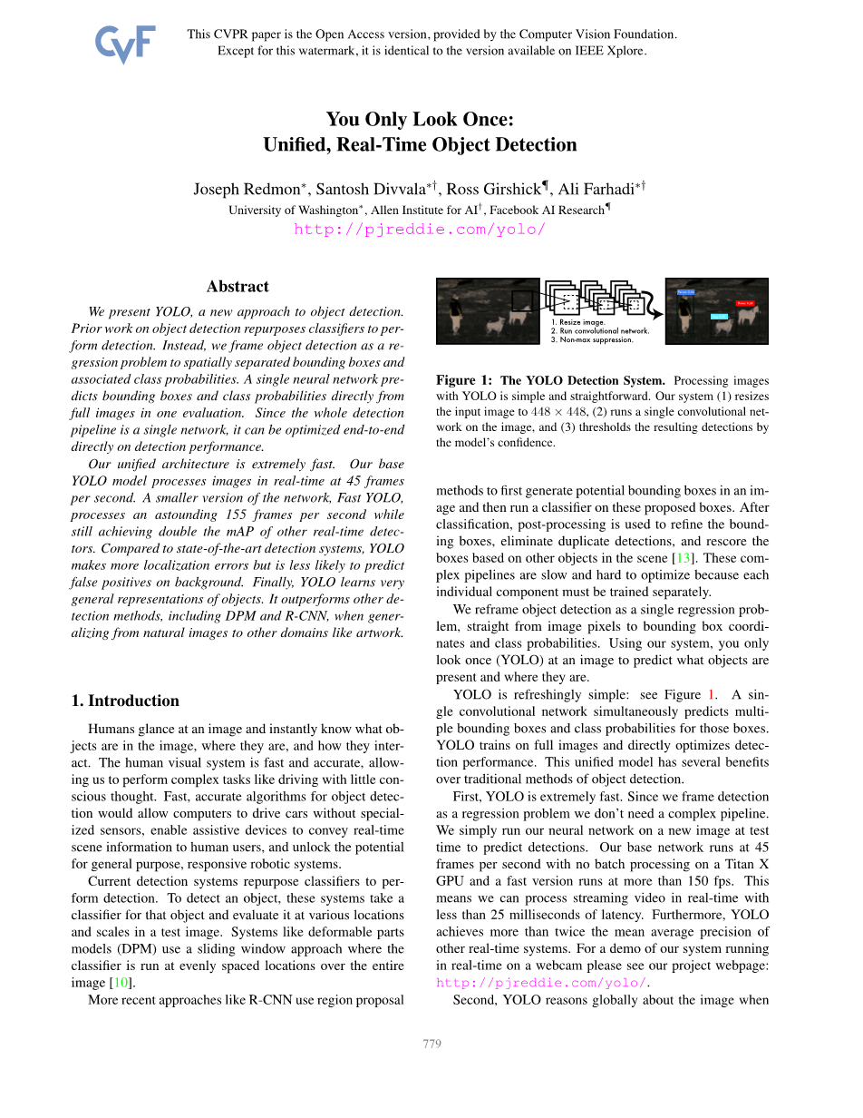 首先,生成图像中潜在边界框,然后在这些拟议的框上运行分类器的方法。 分类后,使用后处理来精简边界框,消除重复的检测,并根据场景中的其他对象对这些框进行重新评分[13]。 这些复杂的管道运行缓慢且难以优化,因为每个单独的组件都必须分别进行训练。