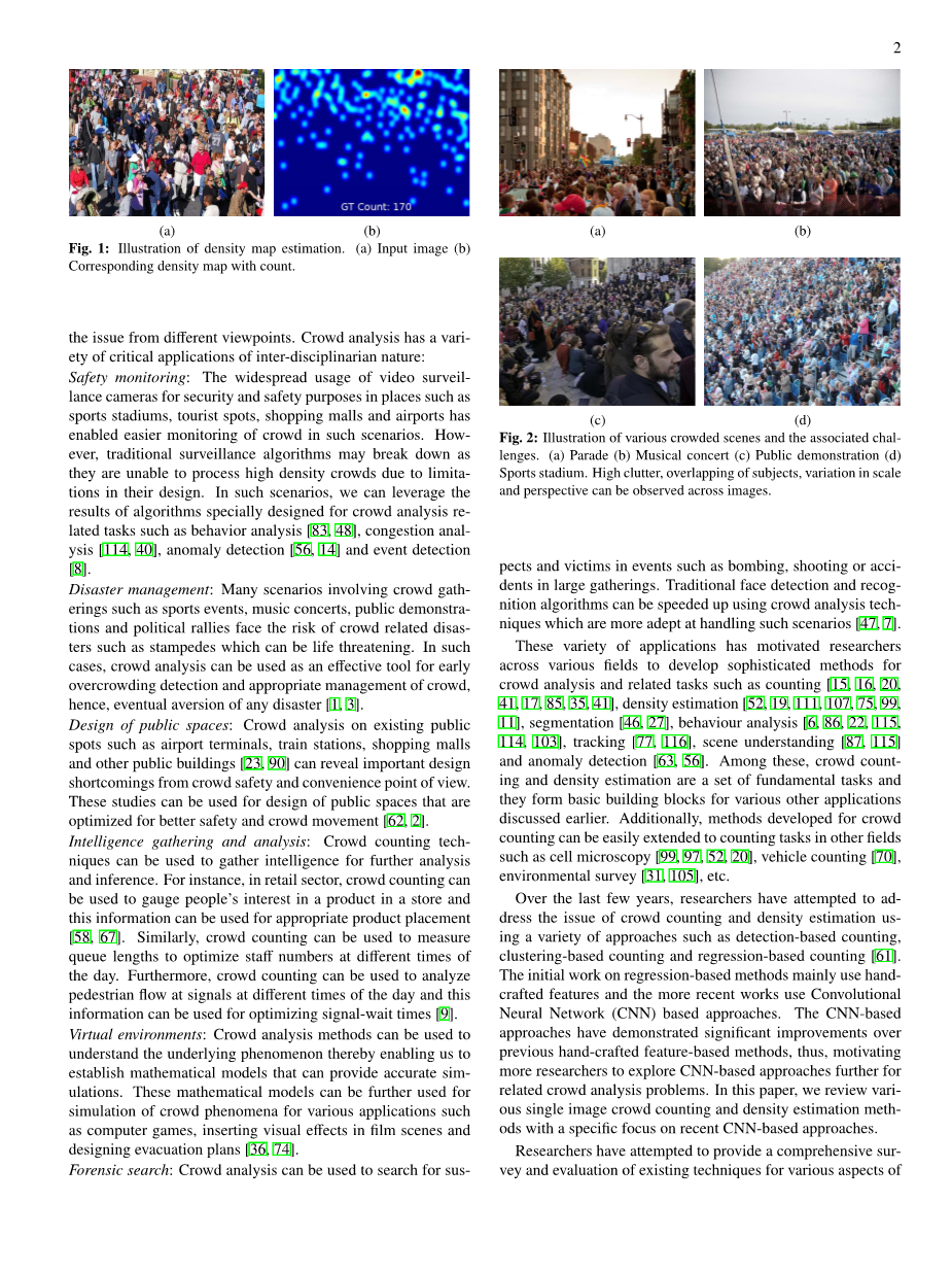 尽管现有的调查分析了用于人群分析和计数的各种方法,但是它们仅涵盖使用人工特征功能的传统方法,并且没有考虑到主要由基于CNN的方法驱动的最新进展[87,39,113,11 ,85、97、4、98、111、107、70、88]和新的具有挑战性的人群数据集的创建[106、107、111]。尽管基于CNN的方法已大大降低了错误率,但新数据集的创建使人们能够学习更通用的模型。为了跟上人群计数方面迅速发展的研究步伐,我们认为有必要详细分析这些方法以了解趋势。因此,在本文中,我们提供了对基于CNN的最新技术的概述,该方法用于对单个图像进行人群计数和密度估计。