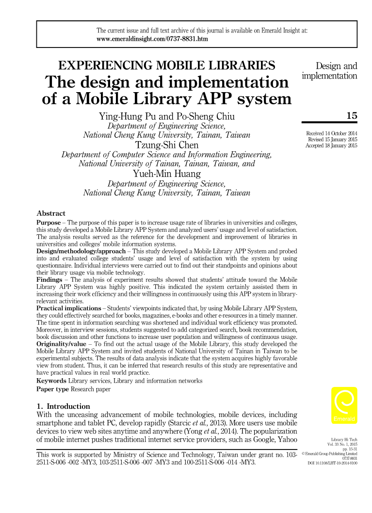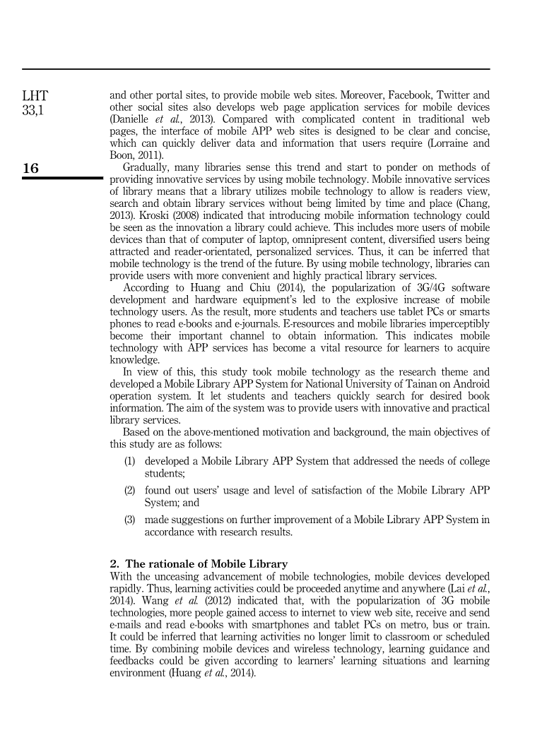 最近,移动技术与移动设备相结合已经成为一个重要信息采集通道。大量的学生和教师还可以使用平板电脑和智能手机搜索电子期刊、电子书等电子资源。因此,众多的图书馆在图书馆服务引入了移动技术。并且为了使其用户快速搜索所需的信息,他们开发了与移动设备相兼容移动信息系统。这表明,移动图书馆已成为学习者们获取知识的一个重要的资源。