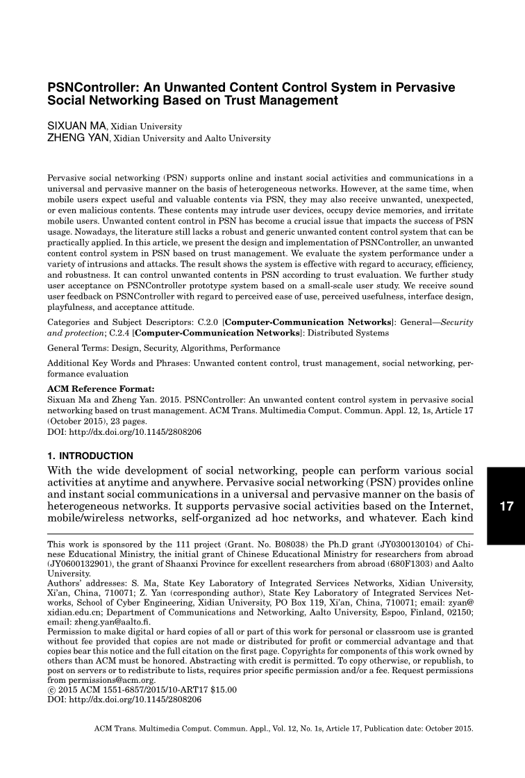 ACM的参考格式:马思玄、闫峥。2015。psncontroller:基于信任管理的普适社交网络中的不期望内
