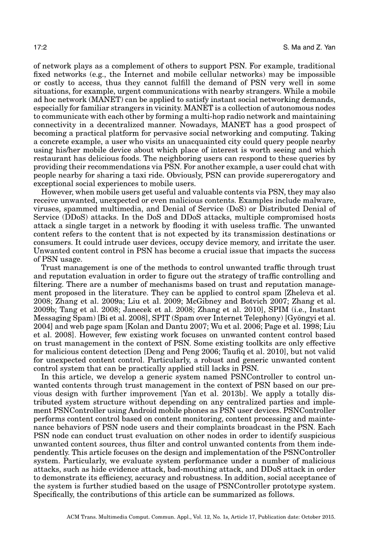 在最近十年中,提出了一些解决方案,通过信任和声誉机制来控制不必要的内容。信任管理是收集信息做出信任决策技术;评价与信任的标准;监测和评估已有的信任关系;从而保证了动态变化的信任关系和自动化这些流程[格兰迪森和Sloman 2000;燕prehofer 2011 ]。铋等。[ 2008 ]提出了一种抗SPIM方法命名为spimrank解决垃圾问题,将信任和信誉机制与黑名单技术。一些解决方案,试图克服网页垃圾邮件[ kolan和丹徒2007;吴等人。2006;页面等。1998;刘等。2008 ]和VoIP垃圾邮件电话(吐)[ 2007 ] kolan和丹徒。然而,这些解决方案在互联网上垃圾邮件的一种特定类型只适用,不通用的,适用于控制各种不必要的内容,尤其是在PSN。