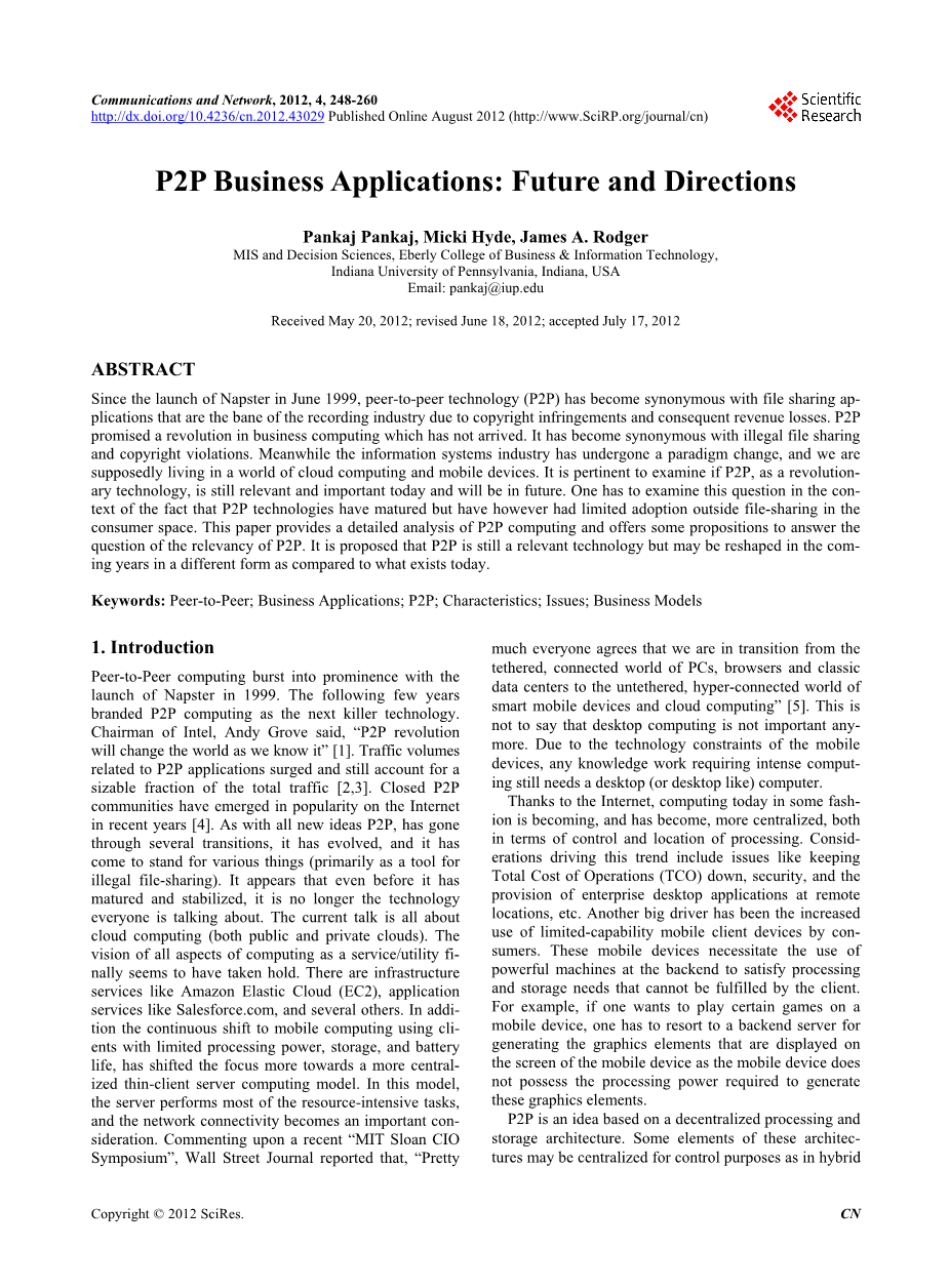 自1999年6月推出了Napster,对等网络技术(P2P)已经成为文件共享应用,由于版权侵权和随之而来的收入损失的唱片业者的代名词。P2P承诺将在一个还没有到的企业计算革命。它已成为非法文件共享和侵犯版权的代名词。与此同时,信息系统产业已经发生了模式变化,我们理应生活在云计算和移动设备的世界。P2P作为一种革命性的技术,在今天和将来都是是息息相关和重要的。但要注意的一个事实,P2P技术已经成熟,但却取得了有限的外面采用文件共享的消费空间。本文提供P2P计算详细分析,并提供了一些命题来回答P2P的相关性的问题。所以建议P2P仍然是一个相关的技术,但相比今天的存在,在未来几年可能会以不同的形式重塑。