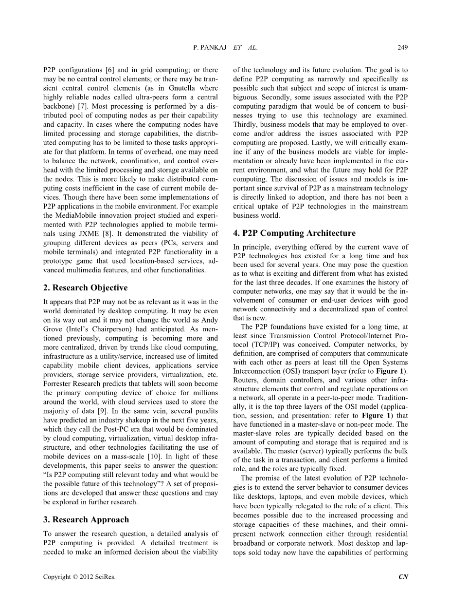 看来,P2P可能没有相关的,因为它是由桌面计算雄霸天下。这可能是即使在它的出路,这可能不会改变世界的安迪·格鲁夫(英特尔公司的主席)的预期。正如前面提到的,计算正在变得越来越集中,由像云计算,基础设施实用程序/服务,使用能力有限移动客户端设备的增加,应用服务提供商,存储服务提供商,虚拟化等Forrester Research的预测趋势的驱动该片剂将很快成为全世界数百万选择的主计算装置,具有用于存储多数数据的云服务[9]。本着同样的精神,一些专家们预测,在未来五年的行业改组,他们称之为后PC时代,将通过云计算,虚拟化,虚拟桌面基础设施和其他技术为主推进有关利用移动设备质量规模[10]。在这样的形势下,本文试图回答这样一个问题:“在今天P2P计算仍然是相关,这项技术未来可能会是什么”?一组命题都尝试回答这些问题,并可能在进一步的研究探讨。