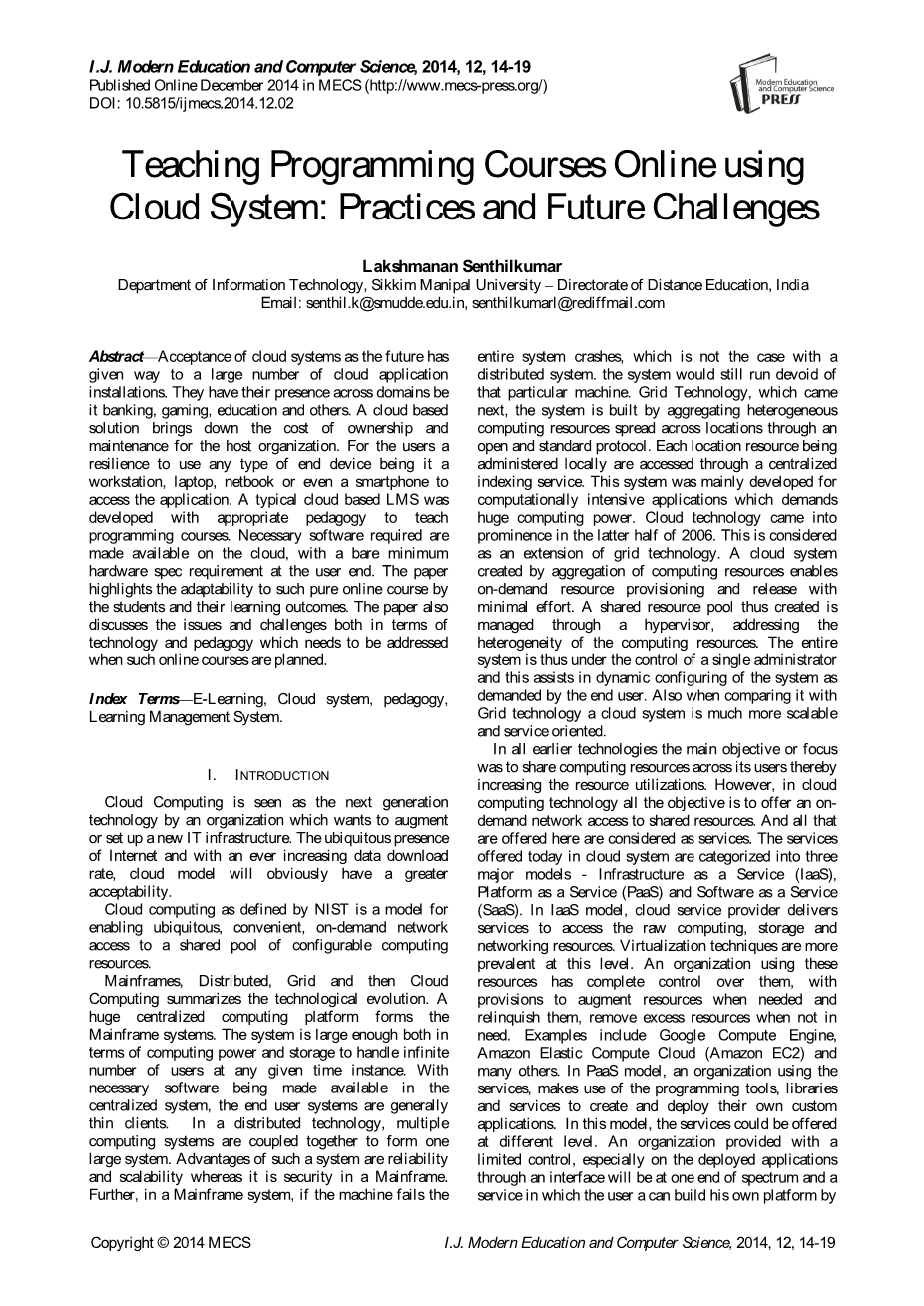 摘要——未来对云系统的接纳为大量云应用程序的安装提供了解决方案。在银行、游戏、教育等很多领域中都能发现它们的跨界存在。基于云的解决方案降低了主体机构的拥有及维护成本。对用户而言,灵活运用任何类型终端如工作站、笔记本电脑、上网本甚至是智能手机,可以对应用程序进行访问。将一个典型的基于云的LMS和适当的教学方法一起开发,可以用来教授编程课程。需要制作可以在云上使用的必要软件,在用户端使用最低限度要求的硬件规格。本文重点关注学生对这种纯粹在线课程的适应性以及他们的学习成果。文章还探讨了当规划在线课程规时,在技术和教学方面需要解决的问题与挑战。