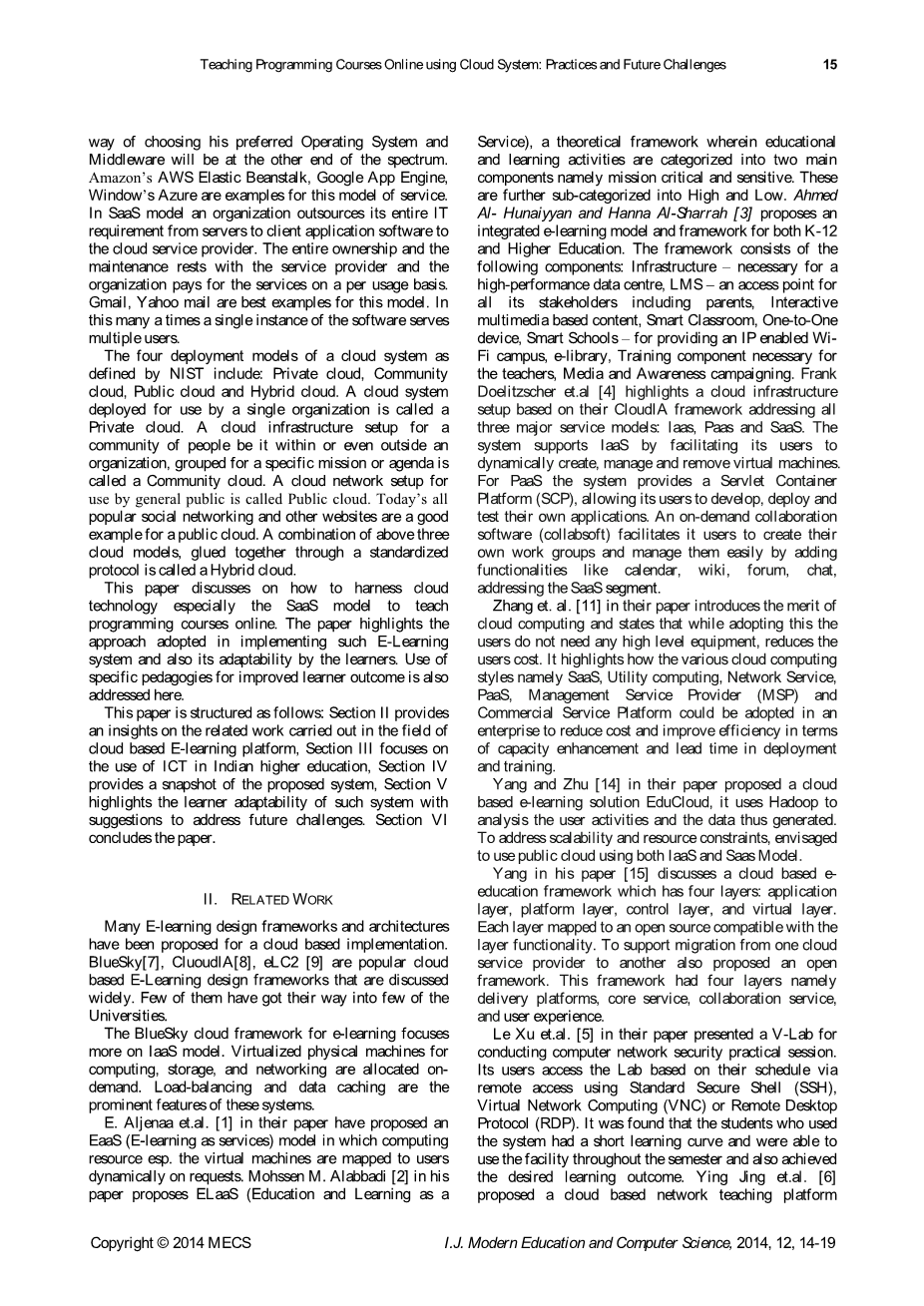 E. Aljenaa等人在他们的论文中提出了EaaS(把在线学习作为服务)的模式,其中计算资源尤其是虚拟机器映射了用户的动态要求。Mohssen M. Alabbadi在他的论文中提出 ELaaS(把教育和学习作为一种服务)的理论框架,其中教育和学习活动被分为两大组成部分,称为关键和敏感任务。 又进一步划分为高级和低级。Ahmed Al- Hunaiyyan 和Hanna Al-Sharrah为K-22和高等教育提出一种集成在线学习模型和框架。这一框架由如下部分组成:基础设施——高性能数据中心所必需的LMS——包括家长、以内容为基础的互动多媒体、智能教室、一对一设备和智能学校在内的所有利益相关者的一个访问点——提供一个IP使校园Wifi、电子图书馆、教师所需的培训组成部分,媒体及意识活动成为可能。Frank Doelitzscher 等人强调建立基于CloudIA框架的云基础设施来解决了所有三大服务模型: Iaas,,Paas 和SaaS。该系统通过促进用户进行动态创建、管理和删除虚拟机器来支持IaaS。对于PaaS,该系统提供一个Servlet容器平台(SCP),允许其用户进行开发、部署和测试他们自己的应用程序。按需协同软件(collabsoft)促进其用户来创建自己的工作组,并且通过添加诸如日历、维基百科、论坛、聊天的功能来更好对工作组进行管理,从而解决SaaS段。