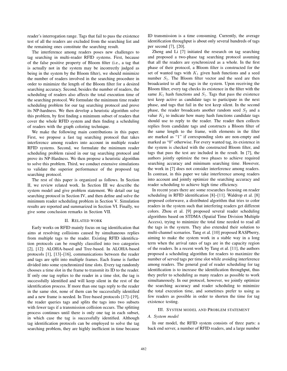 之前对标签搜索是由郑洁和李娜发起的。他们提出了一个两阶段标签搜索Cats协议之间不考虑RFID阅读器干扰,他们使用布隆滤波器测试标签是否存在于系统中。在第一阶段,利用布隆滤波器和其他相应的过滤器得到想要的参数。标签在接收滤波器的参数时,使用滤波器来确定他们所得到的参数与之前预定的是否一致。在第二阶段,阅读器从标签搜集的信息中,通过构造一个虚拟的布隆滤波器,以去除系统内外的干扰。在滤波后结果相对准确时,系统中所搜索到标签才相对精确。然而,这种方法并不适用于多个阅读器进行标签的搜索查询。因为系统所要查询的标签的数量可能会大大超一个RFID阅读器所查询标签的上限。此外,Cats协议木有考虑多个阅读器之间的电磁干扰,它假设所有的RFID阅读器是一个整体。事实上,由于附近的RFID阅读器之间存在干扰,阅读器需要在不同的时间工作,因此在实际情况下,阅读器并不能同步工作。在这种情况下,如果我们直接应用标签搜索协议,它提出的时间效率将是不可预计的,因为这两个阶段需要执行几次,这实际上不必要的。