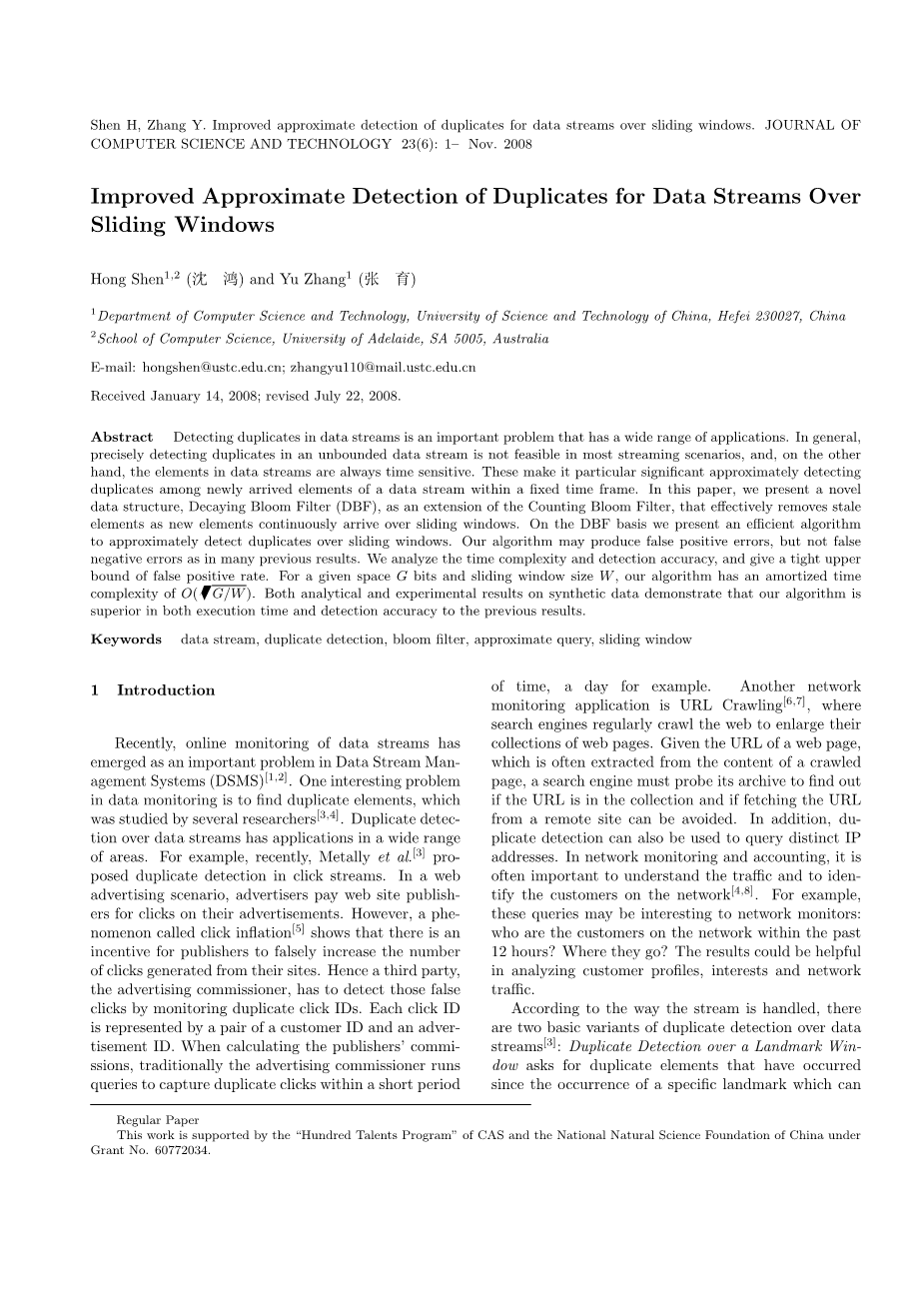 摘要:本文研究了物理性分散分布的数据流重复过滤的问题,为实时监控应用提供了干净的数据。现有的方法只针对局部冗余数据过滤每一个数据流,其在空间和时间上的成本消耗并不适用于高速数据流。基于空间/时间高效的数据结构布隆滤波器,我们提出了一种新的局部滤波算法来有效地过滤局部的重复数据,然后扩展到之前从未被解决的全局重复数据过滤的问题上。为了适应全局重复过滤与局部过滤不同的额外通信开销,我们基于布隆滤波器的分配提出了及时获取和延时获取的方法。理论分析和实验结果表明,我们的解决方案可以有效地过滤局部和全局的重复数据流,并且当参数设置正确合理的情况下,误差也足够小。