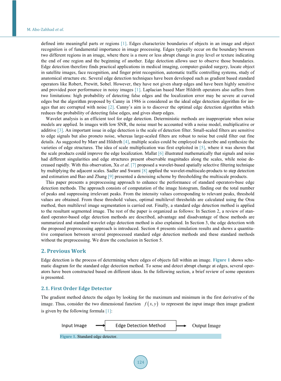 本文提出了一种预处理方法,能够提高各种标准边缘检测算法的准确性以及抗噪性。该方法由图像直方图的计算,找出峰值和抑制不相关的峰的总数。从对应于相关峰的强度值,得到阈值。从这些阈值,阈值优化多级利用最大类间方差法计算,然后进行多级图像分割。最后,对这些分段图像利用标准算法进行边缘检测。本文的主要工作如下:在第2节中,对标准算子的边缘检测方法进行了综述,并对这些方法的优缺点进行了总结,还对标准的小波边缘检测方法进行了阐述。在第3节中,提出了具体的预处理方法。第4节主要是各个实验的仿真结果,并将进行了预处理的图像和未进行预处理的图像所得到的结果进行对比。我们将第5节对这些实验结果进行总结。