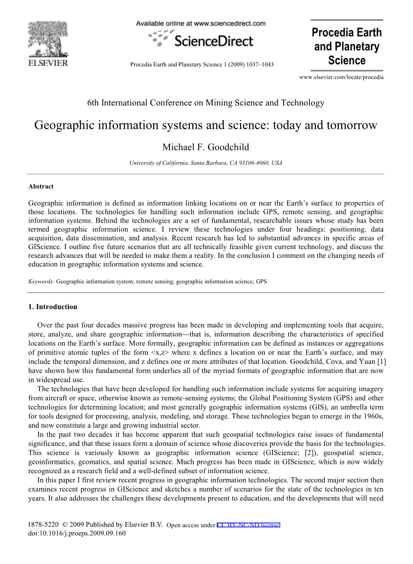 然而,在一般领域的空间信息理论(COSIT)已取得重大进展并由两年一次的会议空间信息理论的建立。世界的地理概念之间的主要区别,称为离散对象和连续的场,在20世纪80年代后期的不确定性的背景下首次发现,已经成为理论的一个核心要素。本人在2007年[10]表明,第一个概念统一称为地理原子概念,以及其他的一些先进数据模型,包括对象领域与元图,第二个概念称为地理的偶极。