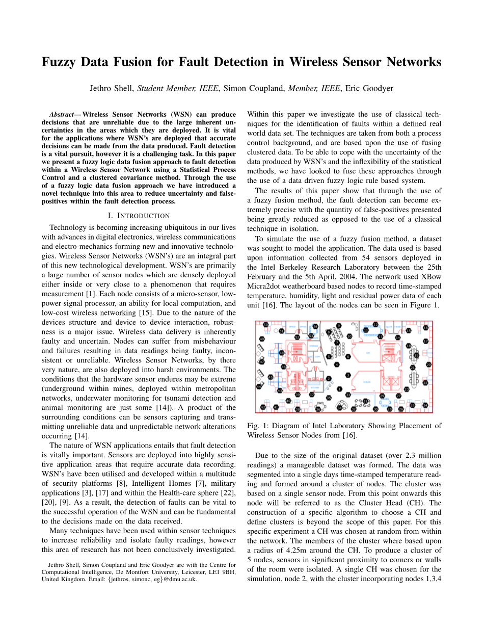 为了模拟使用模糊融合的方法,找了一个数据集来模拟应用。所使用的数据是基于部署在英特尔伯克利实验室的54个传感器2月25日和2004年4月5日之间收集的信息。网络应用xbowmicra2dot护墙基础节点记录时间戳的温度、湿度、光每个功率数据和残余单元。节点的布局可以在图1中看到。