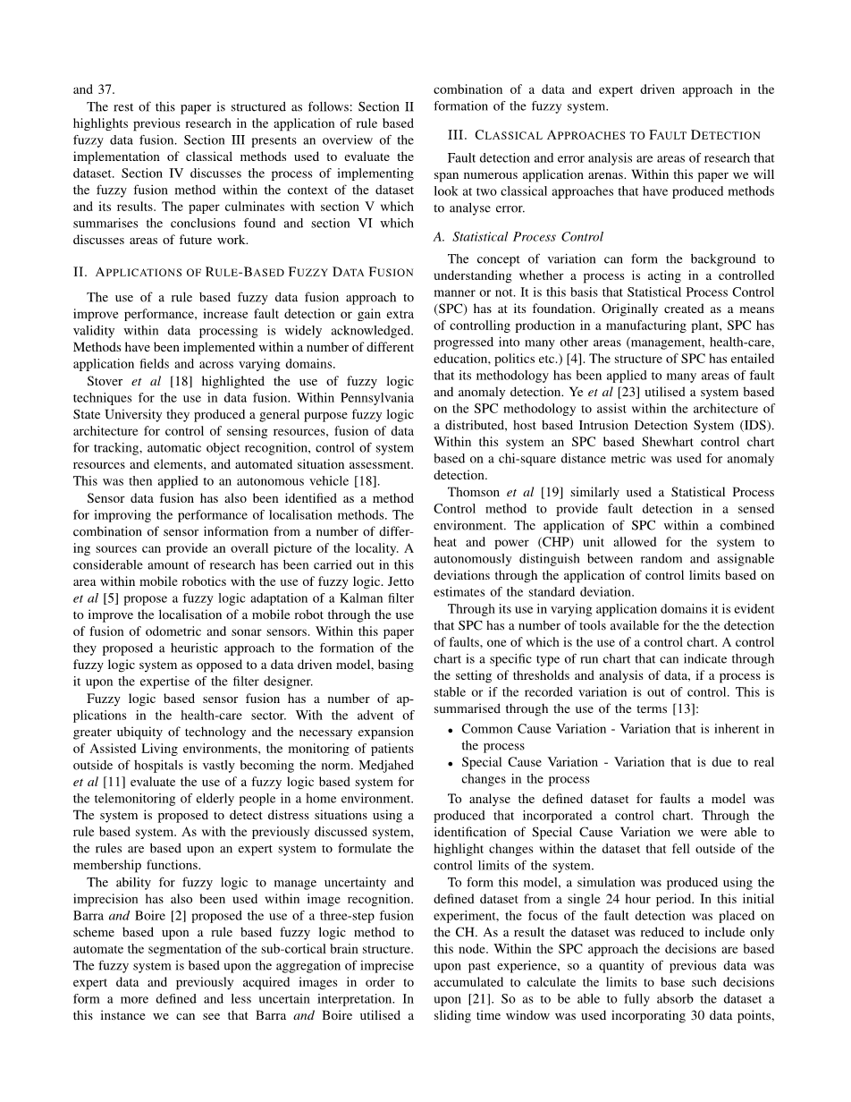 汤姆森等人同样使用了一种统计过程控制方法,在感测环境中提供故障检测。SPC的应用在热电联产(CHP)单位允许的系统自动区分随机分配偏差之间通过基于标准偏差的估计控制限应用。