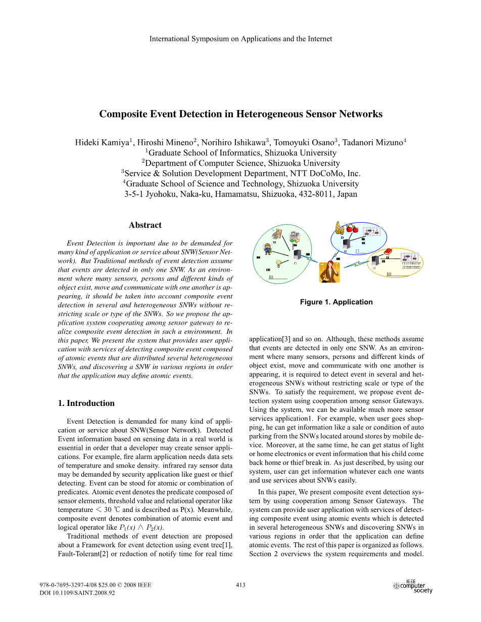 复合事件检测由于对SNW (传感器网络)有着许多方面的重要应用,所以显得十分重要。但是传统的事件检测的方法认为检测事件是否发生只需要一个传感器网络就能确认。当环境中存在着许多的传感器、 人类和不同种类的物体时,会发生一个事物与另一个事物之间的相对移动和信息交换。所以应该考虑到有不同种类的和没有限制范围的异构传感器网络中的复合事件检测。因此,我们建议在这样的环境下,应用系统合作传感器网关来实现复合事件检测。在本文中,我们目前的系统为用户的应用程序提供的复合事件检测服务的由原子事件组成的,是分布式异构传感网络,传感器网络布置在不同的区域,以便应用于可以定义原子事件。复合事件检测合事 件检测合事 件 检 测合